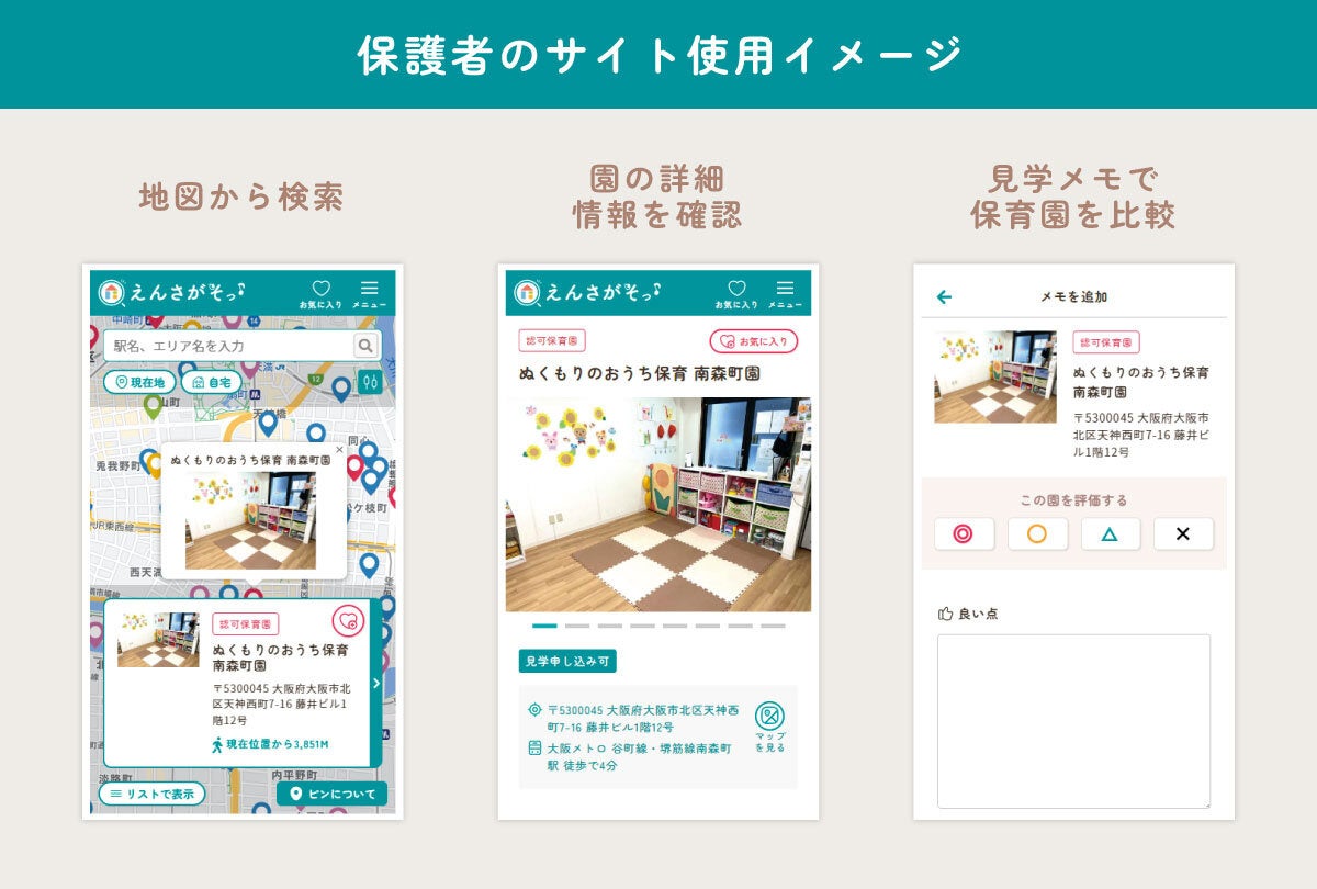 保護者は、「えんさがそっ♪」を利用することで、自宅や現在地付近の保育施設を地図上で簡単に検索できたり、気になる保育施設をお気に入り登録して後からまとめて見返せたり、お問い合わせや見学の申し込みをすることができます。