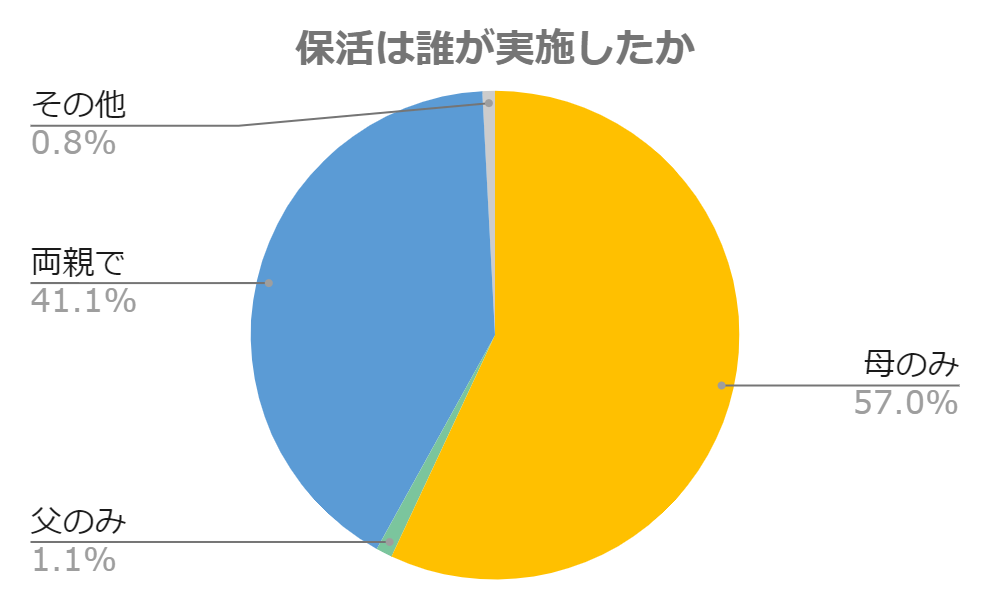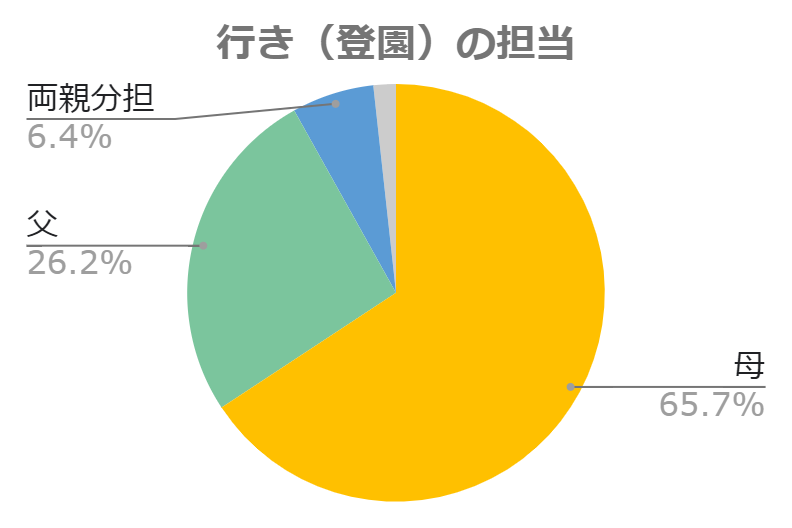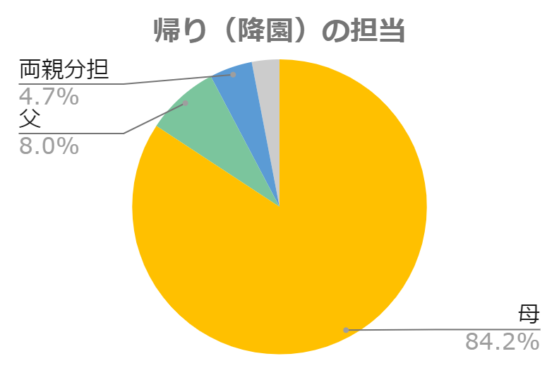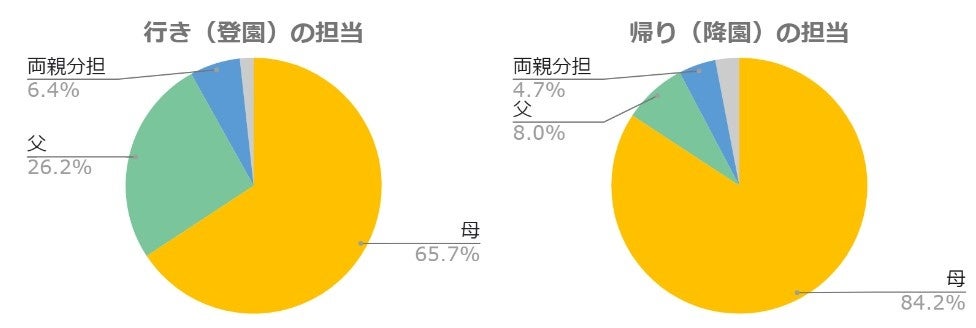 また、子どもが通う保育施設を探す「保活」および保育施設に通い始めてからの「登降園の分担」についてアンケート調査を実施したところ、保活では半数以上にあたる57%が母親のみで実施しており、登降園に関しても登園65%、降園に至っては84%を母親が担当している実態が明らかになりました。