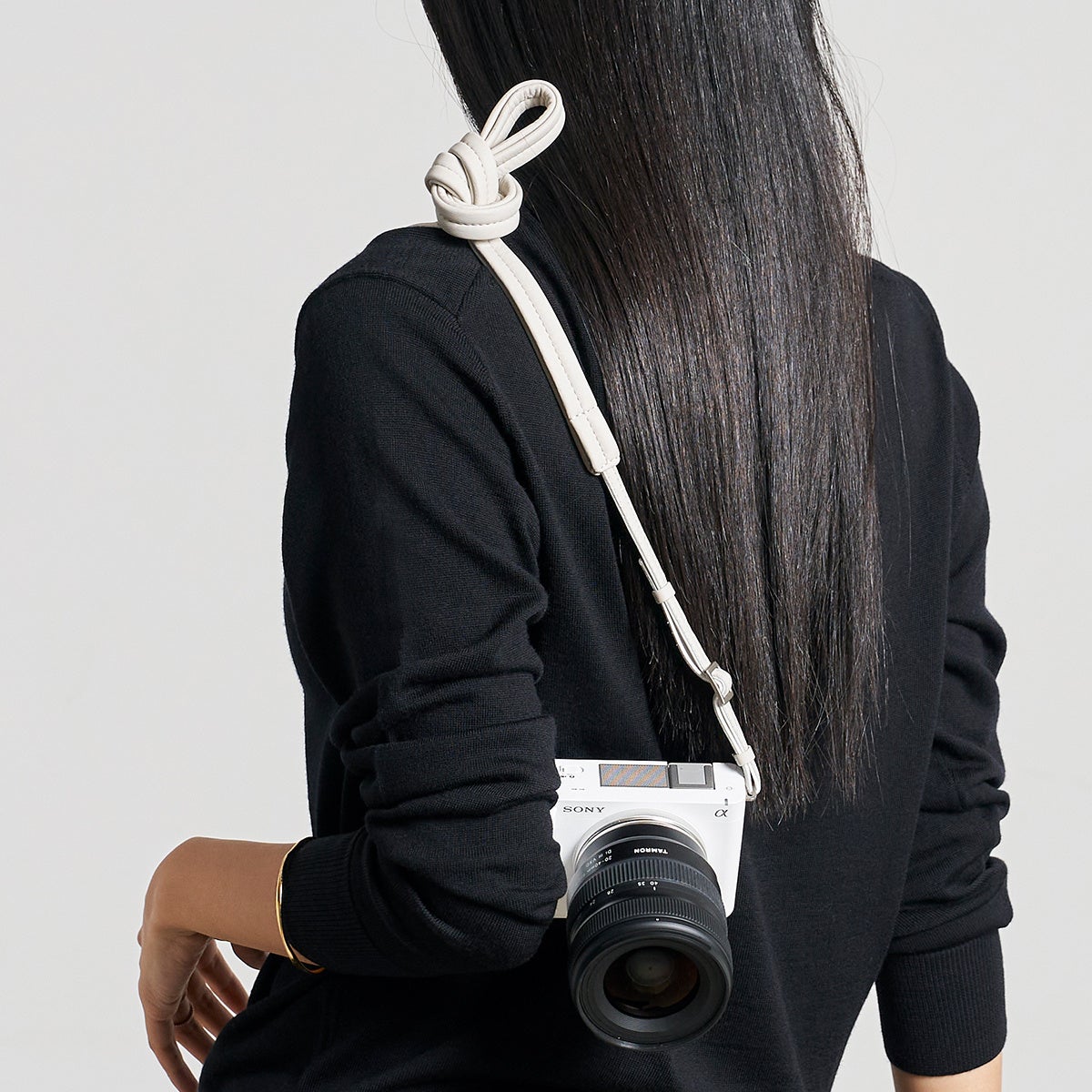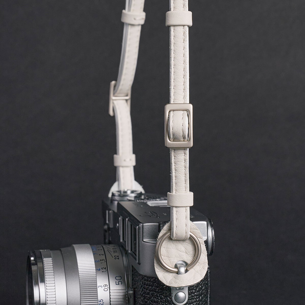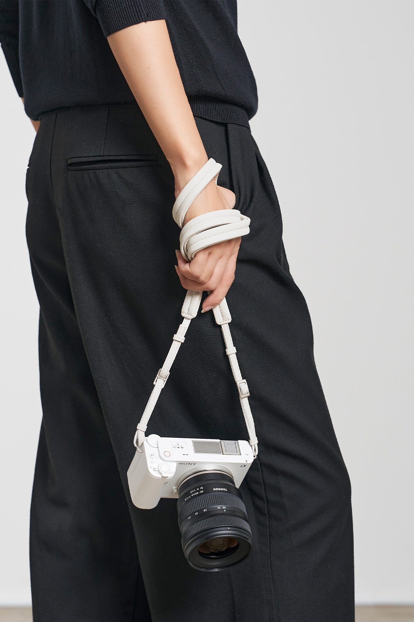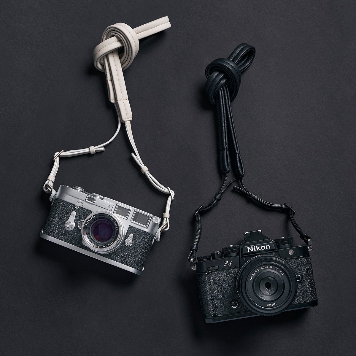 また、レザーと色味を合わせた調節金具等の細部にもこだわり、統一感のある美しさを追求。カラーは「ブラック」と「オフホワイト」の2色で展開。日々のスタイリングや、お使いのカメラの色味に合わせてお選びいただけます。