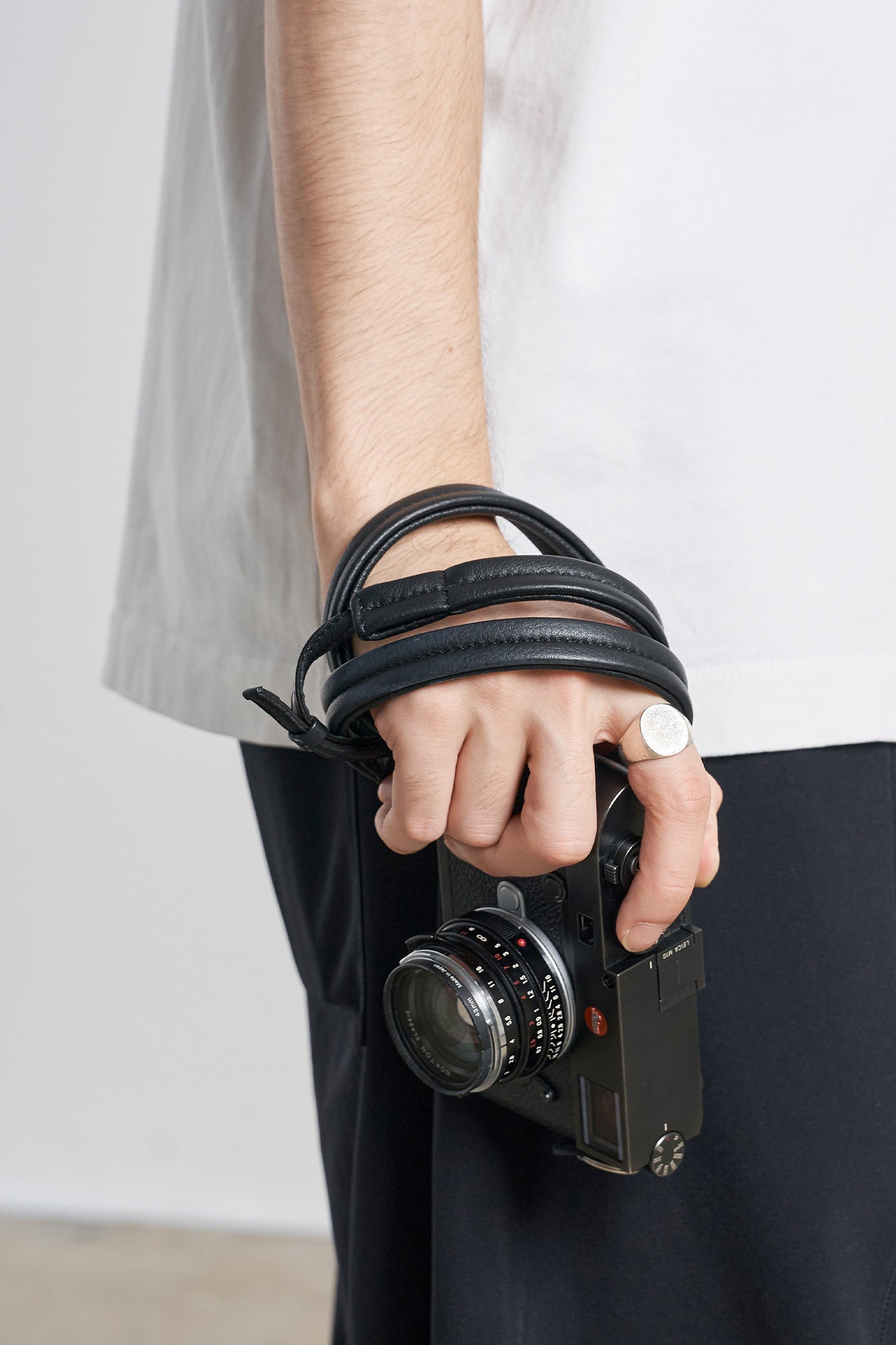 機種問わずカメラを装着できるように、真鍮製の丸カンとレザー製の丸カンカバーを付属。また、長さ調節によって斜め掛けや首掛けにも対応。ストラップのしなやかさによって結んで肩掛けしたり、手に巻き付けて手持ちしたりと、自由なカメラの持ち方を可能にします。