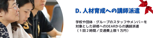 D:人材育成のための研修への講師派遣(2件):学校や団体・グループのスタッフやメンバーを対象とした講座へのDEARからの講師派遣(1回2時間/交通費上限1万円含む)をプレゼントします。