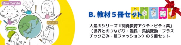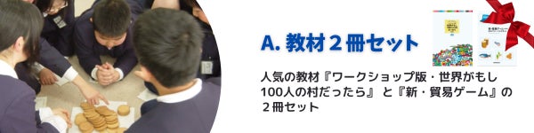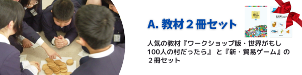 A:教材2冊セット(35件):人気の教材『ワークショップ版・世界がもし100人の村だったら』と『新・貿易ゲーム 経済のグローバル化を考える』の2冊をセットにしてプレゼントします。