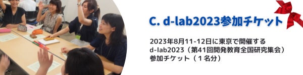 C:d-lab2023参加チケット(18件):2023年8月11日(金・祝)・12日(土)に開催するd-lab2023(第41回開発教育全国研究集会)の参加チケット(1名分)をプレゼントします。d-labでは、講演や分科会、ワークショップ体験、自主企画・発表などを通して全国の開発教育実践者、教育関係者、学生、NPO/NGO、国際協力関係者など、多様な人々との出会いと学びが得られます。会場は東京・JICA地球ひろばです(交通費は自己負担です)。