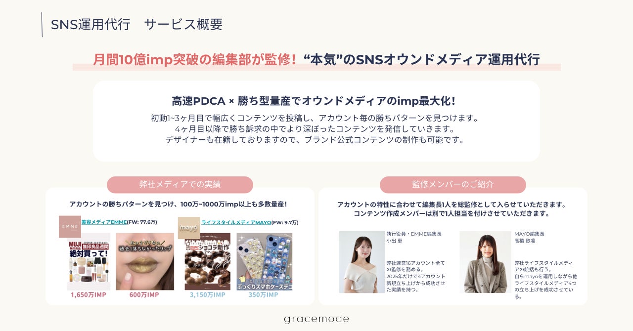 弊社はこれまで、月間10億視聴を突破する自社美容メディアを運営し、目まぐるしく変わるSNS市場の「勝ち筋」をリアルタイムに蓄積してまいりました。こうした中で寄せられた「プロの知見を直接自社アカウントに反映したい」という多くの切実な声に応え、この度、gracemode編集部によるSNS運用支援サービスを本格始動いたしました。