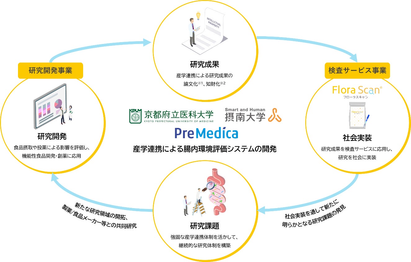 本デザインによる産学連携体制は一時的なものではなく、継続的な共同研究を前提としており、腸内環境評価システムの継続的なアップデートを目指しています。京都府立医科大学、摂南大学による継続的な研究により新たなエビデンスを構築し、プリメディカによって研究成果の社会実装(≒事業化)を推進します。