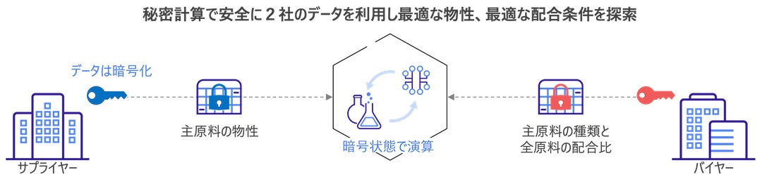 近年、欧米や中国の化学産業では、国家や大企業を中心に企業を超えたデータの集約と活用が進んでいます。一方、日本の化学産業は多様な企業や研究者によって構成されデータの集約が困難なため、各企業内でのデータ活用にとどまっています。このため、日本企業のグローバル競争力の低下が懸念され、政府主導の有識者会議でも「マテリアルデータに関する企業間連携」について多くの議論が行われており、この問題を解決する技術として注目されているのが「秘密計算」です。秘密計算は、実験データの秘匿性を保ちながら共有や活用が可能な技術です。データを暗号化したまま他の企業と安全に計算を行うことができ、特許や知財保護の観点からもデータの共有が安心して行えます。大塚化学は、2019年より取組開始したMIの有用性実証の過程において、企業間データ連携の推進がMI活用の価値を最大化しうると考え、この度、業界に先駆け秘密計算を利用した企業間データ連携MI製品”EAGLYS ALCHEMISTA”のPoCを実施するに至りました。