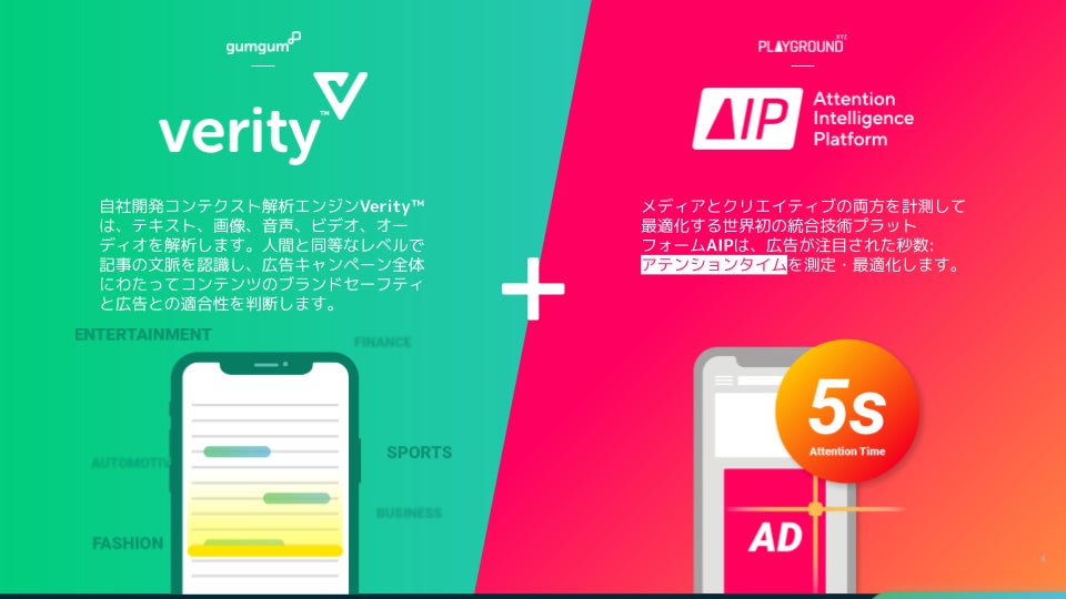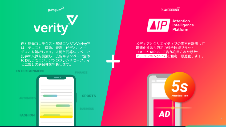 GumGumとPlayground xyzは、本キャンペーンでGumGumのコンテクスト解析プラットフォームVerity™と、Playground xyzの統合技術プラットフォームAIPを融合させた手法を初めて活用しました。この画期的なアプローチにより、消費者のアテンション(広告注目度)が最も高い記事文脈へ配信を最適化しました。