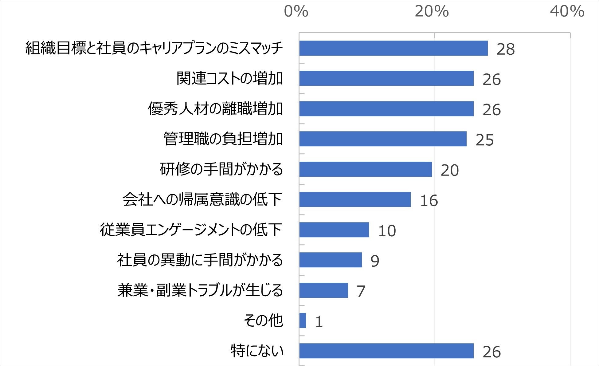 「キャリア自律」の推進を開始した、もしくは検討し始めた当初に懸念していたデメリットについては、「組織目標と社員のキャリアプランのミスマッチ」が最多で28%、次いで「関連コストの増加」と「優秀人材の離職増加」がともに26%などとなっている。