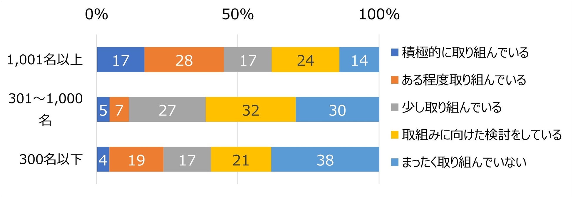 従業員数1,001名以上の大企業では、「ある程度取り組んでいる」が最多で28%、「積極的に/少し取り組んでいる」がともに17%で、これらを合計すると「取り組んでいる」(以下同じ)の割合は62%と6割以上となっている。また、「取組みに向けた検討をしている」(24%)まで合わせると、「前向きに対応している」(以下同じ)の割合は86%と9割近くにも上っている。
