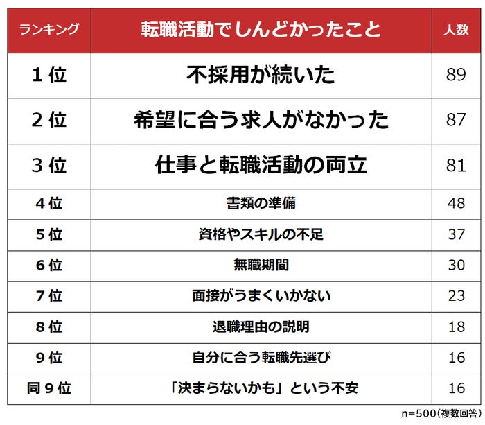 転職経験がある500人にアンケートを行ったところ、「転職活動でしんどかったこと」第1位は「不採用が続いた」でした。