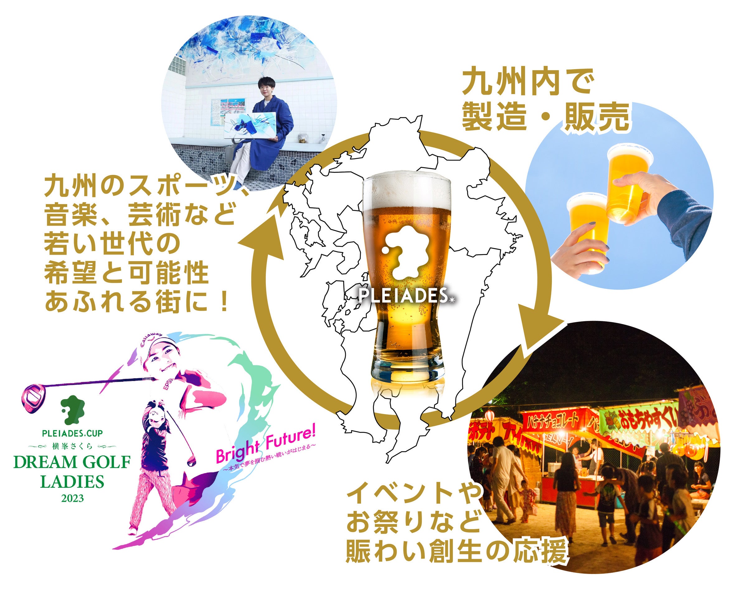 社会と人をサポートし、モノとココロの幸福を追求することで地域貢献する仕組みを作る企業の佐伯岳大と、九州発の飲料ブランド「PLEIADES(プレアデス)」を通じて、福岡・九州の地域経済・社会を活性化するチャレンジを続ける萩野郁夫は、「九州の人が、九州のために飲む、九州を代表するブランド」を作るという熱い想いのもと、共同で「九州麦酒株式会社」を設立しました。九州麦酒は「PLEIADES BEER」を介して、収益の一部を福岡・九州で活躍する個人や団体に還元し、福岡・九州の街を盛り上げるための活動をしていきます。