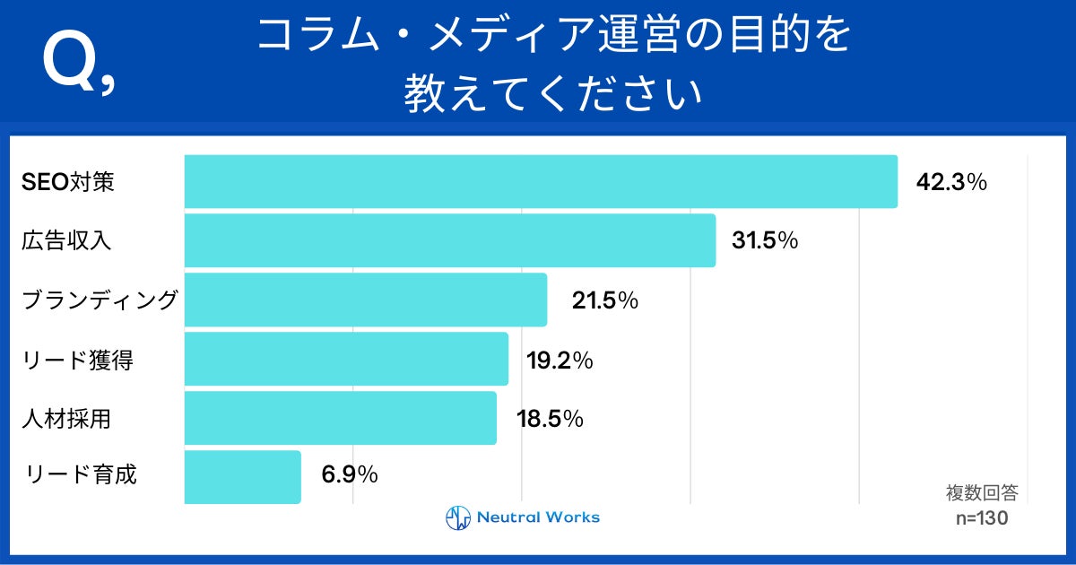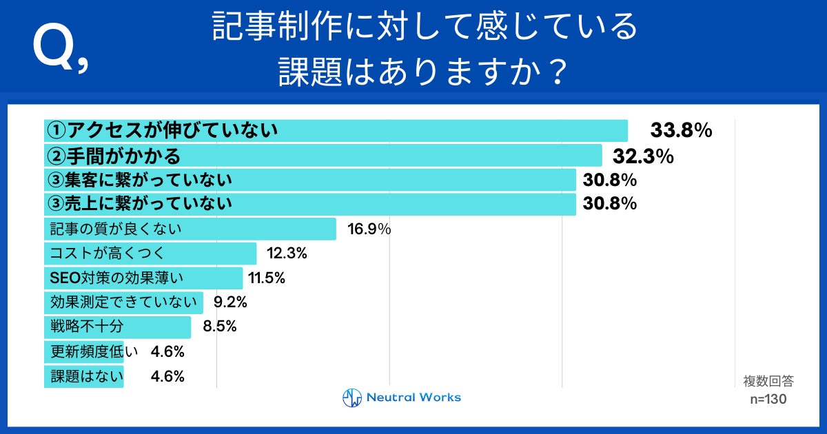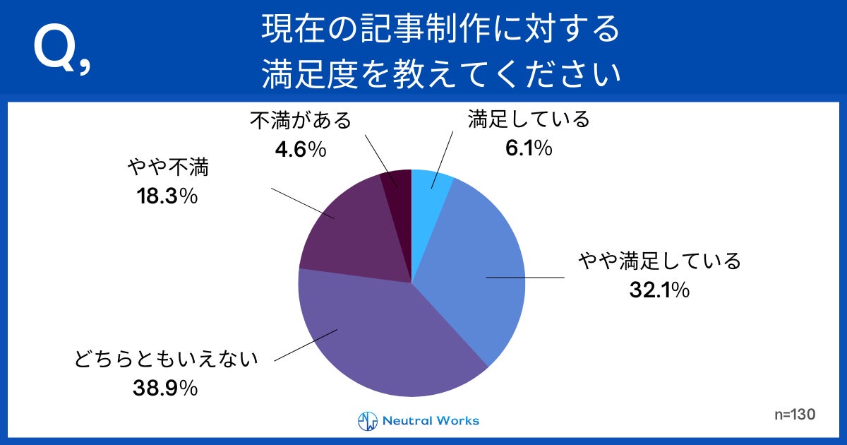 デジタルマーケティング支援をしている株式会社ニュートラルワークス(神奈川県茅ヶ崎市 代表取締役:三木五月、以下「ニュートラルワークス」)は、自社コラムやオウンドメディアなどを運営している企業に所属の方130名を対象に、記事制作に関する実態調査を行いました。