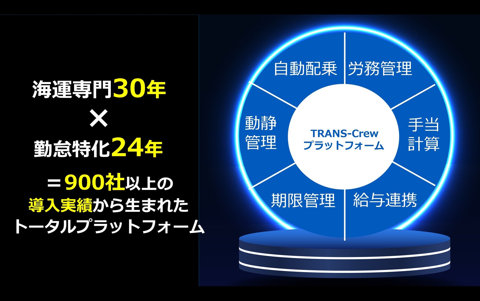 『TRANS-Crew』は、「船員向けプラットフォーム」の実現をビジョンに掲げ、資格情報と連動した配乗計画の自動化機能(β版)をすでに提供開始しています。今後は、AIを活用した最適化・分析機能を段階的に拡充し、配乗計画、労務管理、給与連携、資格管理を一元化。業務効率のさらなる向上と働き方改革を通じて、海運業界のDXを継続的に加速してまいります。