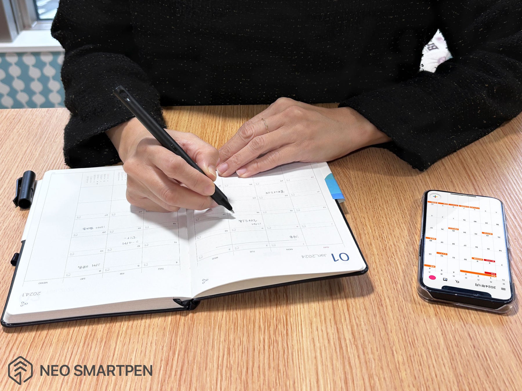 この手帳にNeo smartpenで手書きした予定は、専用アプリ「Neo Studio」によりノーステップで書いたそのままデジタル化。今まで通り紙に書くだけでデジタルで保存されます。手書きなのに検索もできる驚き、利便性を日常にできる紙の手帳です。