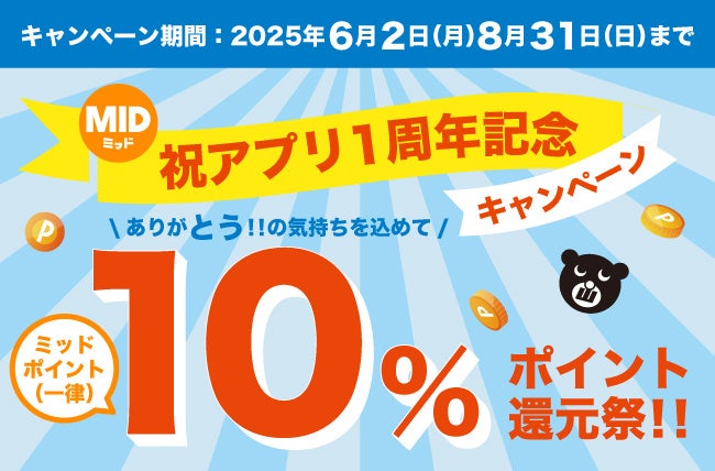 大きいサイズのメンズ服通販サイト「ミッド・インターナショナル」( https://www.bigsize.co.jp/ )を運営する株式会社マンチェス(本社:岐阜県岐阜市、代表取締役:髙見澤 聡)は、2025年6月2日(月)~8月31日(日)まで、公式アプリ誕生一周年記念&「いつもありがとう」の気持ちを込めて、アプリでのお買い物で10%ポイント還元祭りを開催することを発表しました。