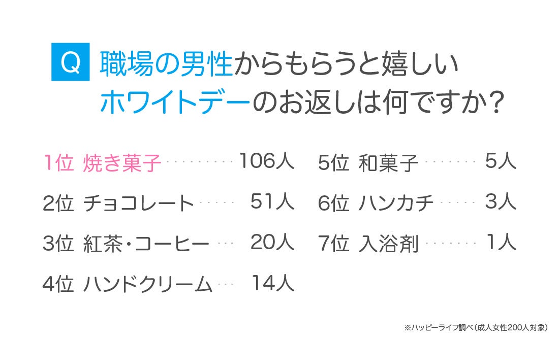 成人女性200人に職場の男性からもらうと嬉しいお返しを聞いてみたところ、「焼き菓子」が過半数を占めて1位でした。