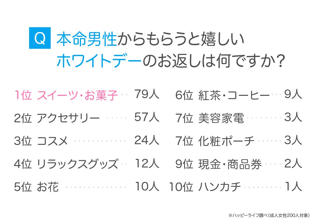成人女性200人に本命男性からもらうと嬉しいお返しを聞いてみたところ、1位は「スイーツ・お菓子」で全体の4割を占めていました。