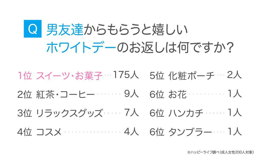 成人女性200人に男友達からもらうと嬉しいホワイトデーのお返しを聞いてみたところ、圧倒的に多かったのは「スイーツ・お菓子」でした。