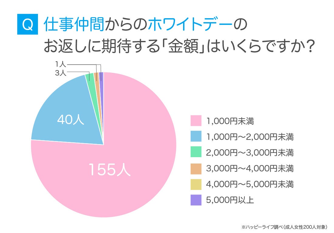 仕事仲間からのホワイトデーのお返しに期待する金額を聞いたところ、「1,000円未満」が約8割を占めて最多でした。