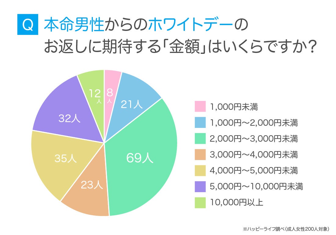成人女性200人に本命男性からのホワイトデーのお返しに期待する金額を聞いてみたところ、もっとも多かった回答は「2,000円〜3,000円未満」でした。