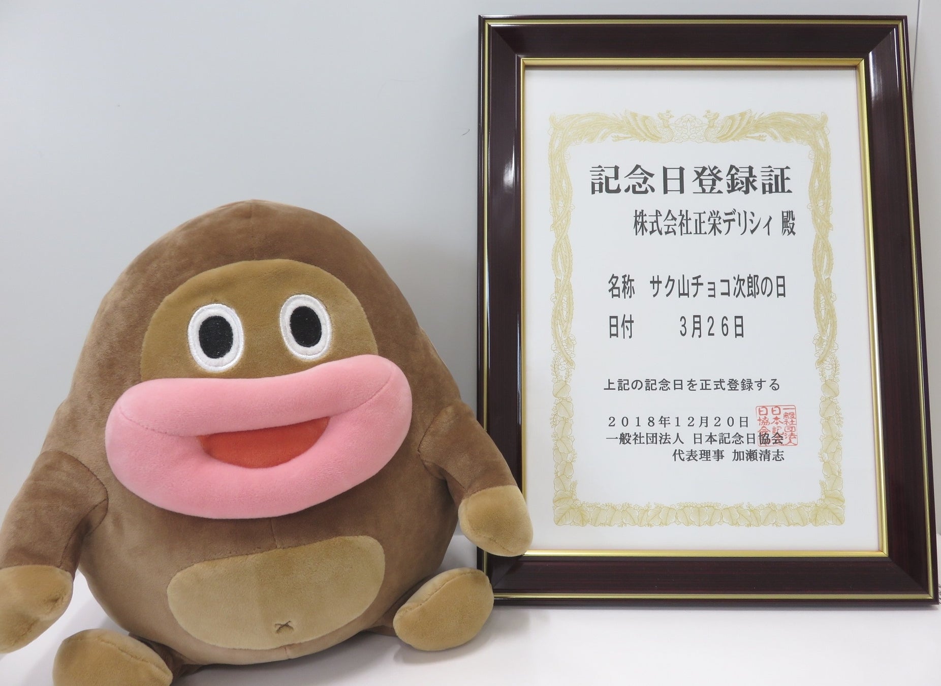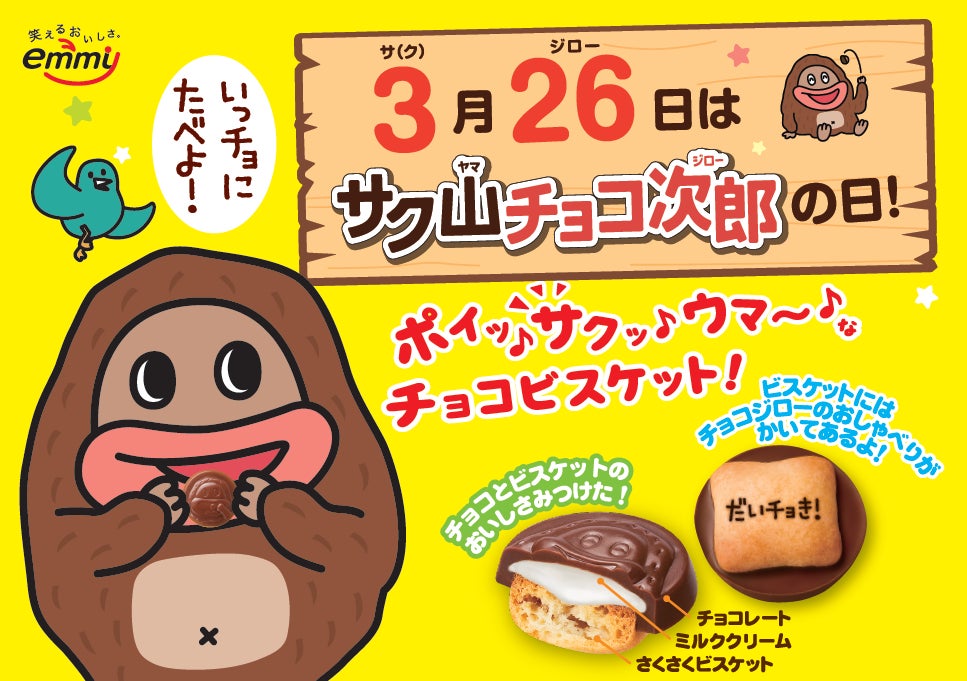 サク⼭チョコ次郎の美味しさやコミュニケーションの楽しさをより多くの⽅に知っていただくことを⽬的に、3⽉26⽇を「サ(3)ク⼭チョコ次郎(26)の⽇」として定めています(⼀般社団法⼈⽇本記念⽇協会認定)。