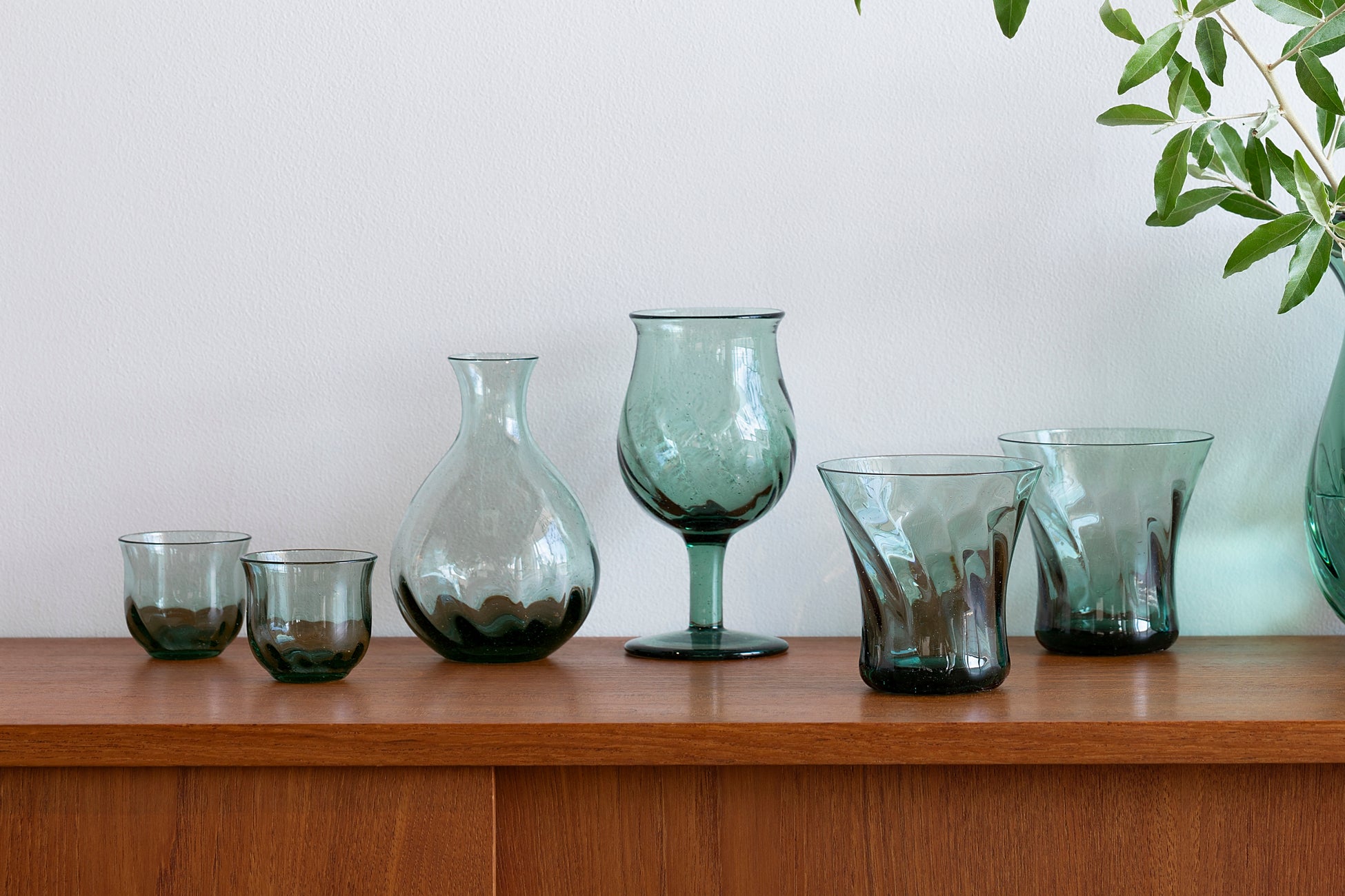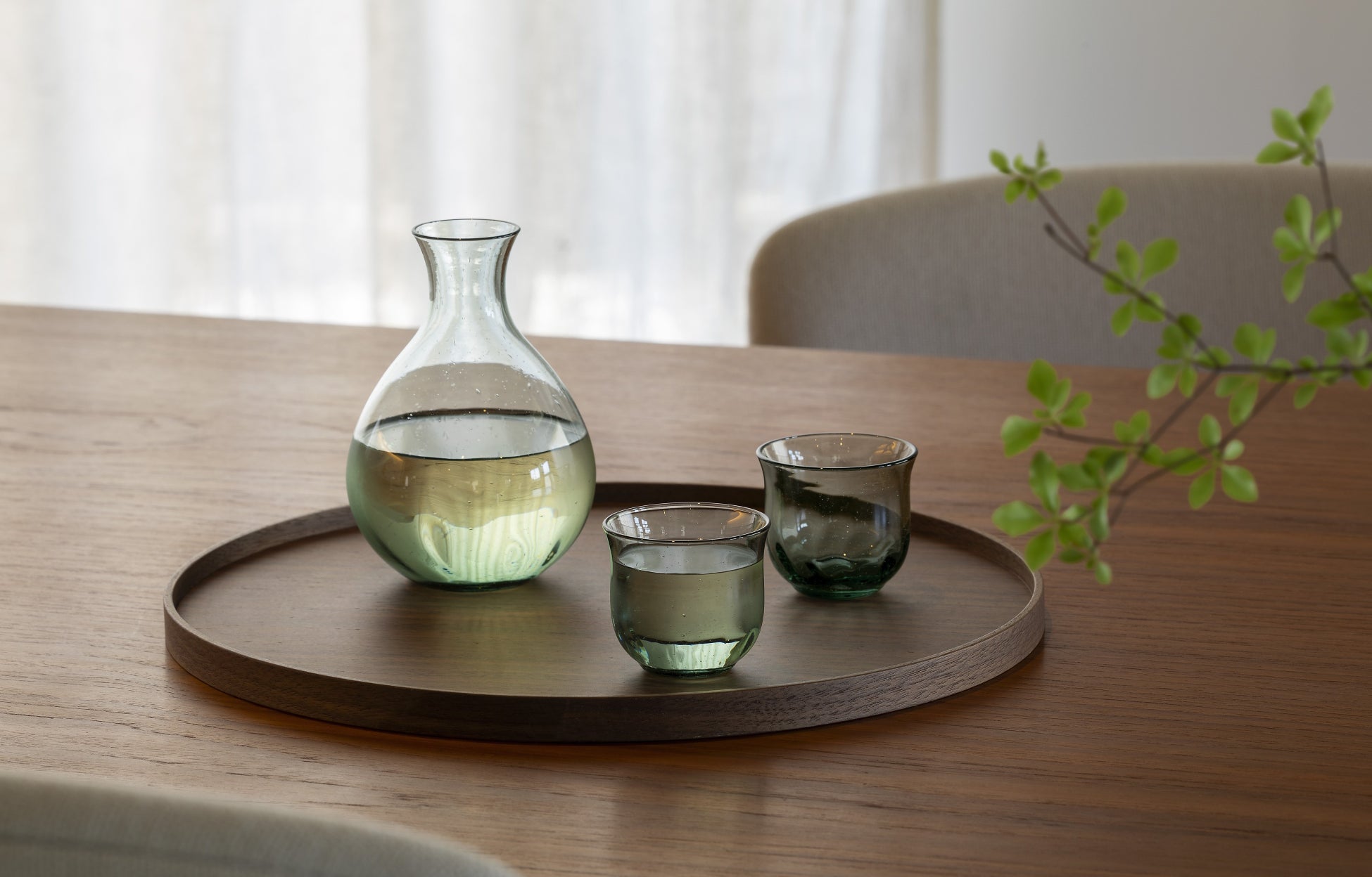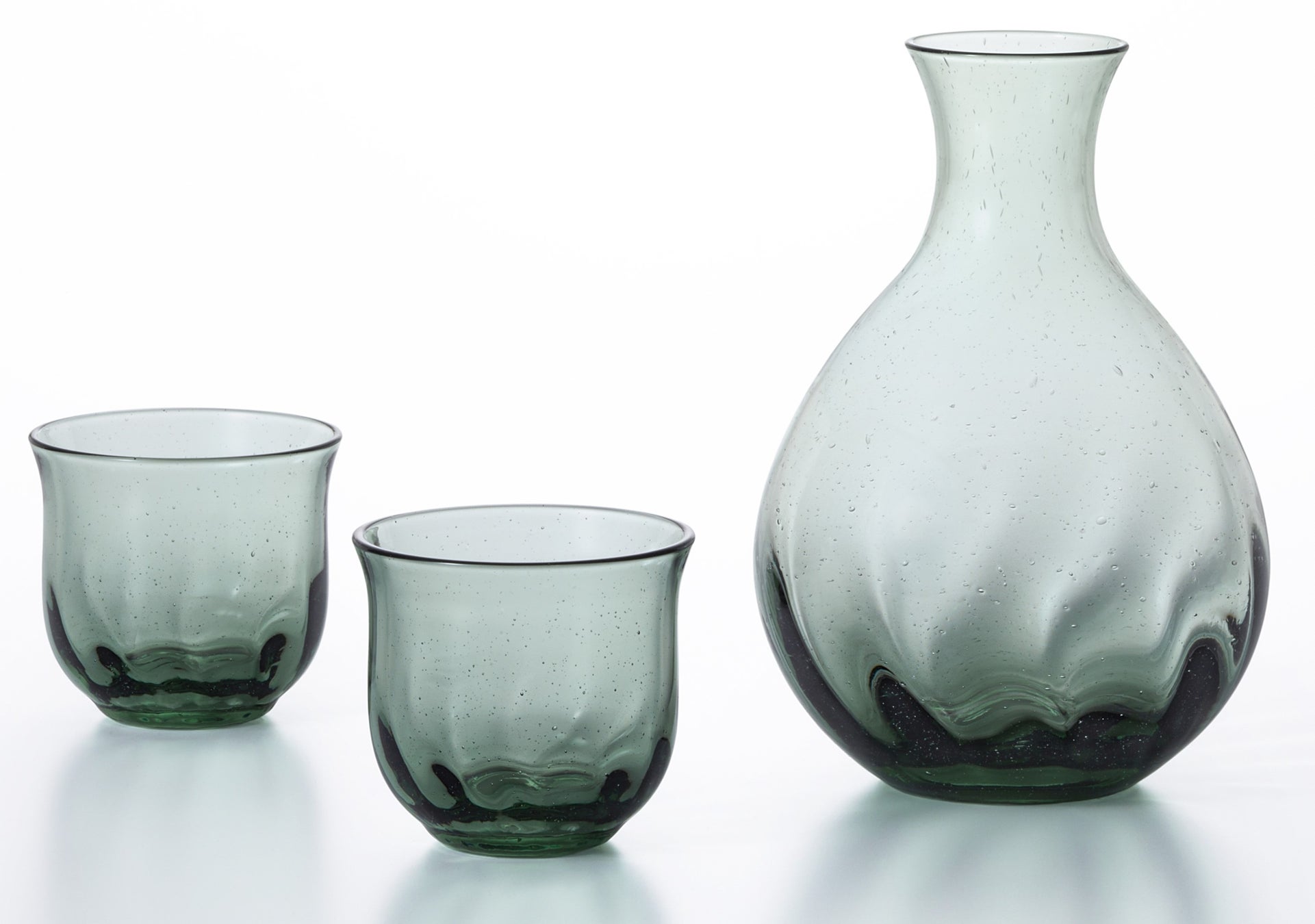 第二弾は、最大の特徴である浮玉100%再利用ならではの深みのある青緑色、曲線的でありながらシンプルな形状、海を想起させる波模様はそのままに、薄づくりに仕上げた口当たりの良いロックグラスや、伝統工芸士が仕上げる“宙吹き”製法の台付きグラスなど、暮らしの中で日々お使いいただける酒器アイテムを揃えました。