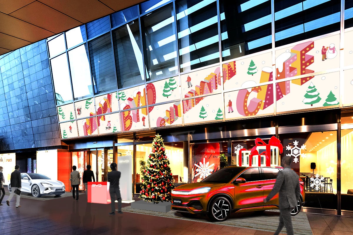 会期中は、電気自動車ブランドであるBYDが、クリスマスにはかかせないイルミネーションのように電気を使ったeモビリティで世の中を明るくしたいという思いから、「HAPPY BYD e-LLUMINATION(ハッピービーワイディーイルミネーション)」をコンセプトに、屋外広告や車両展示に加え、V2L機能※1を使用したイルミネーション装飾などを展開してまいります。また、近接するヒルズカフェ/スペースにて期間限定の「BYD e-LLUMINATION CAFE(ビーワイディーイルミネーションカフェ)」も展開し、今回のイベントのために開発したBYDオリジナルメニューもお楽しみいただけます。