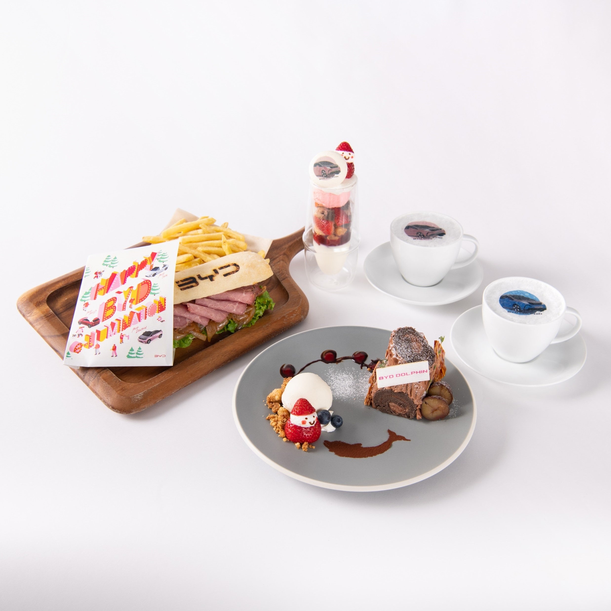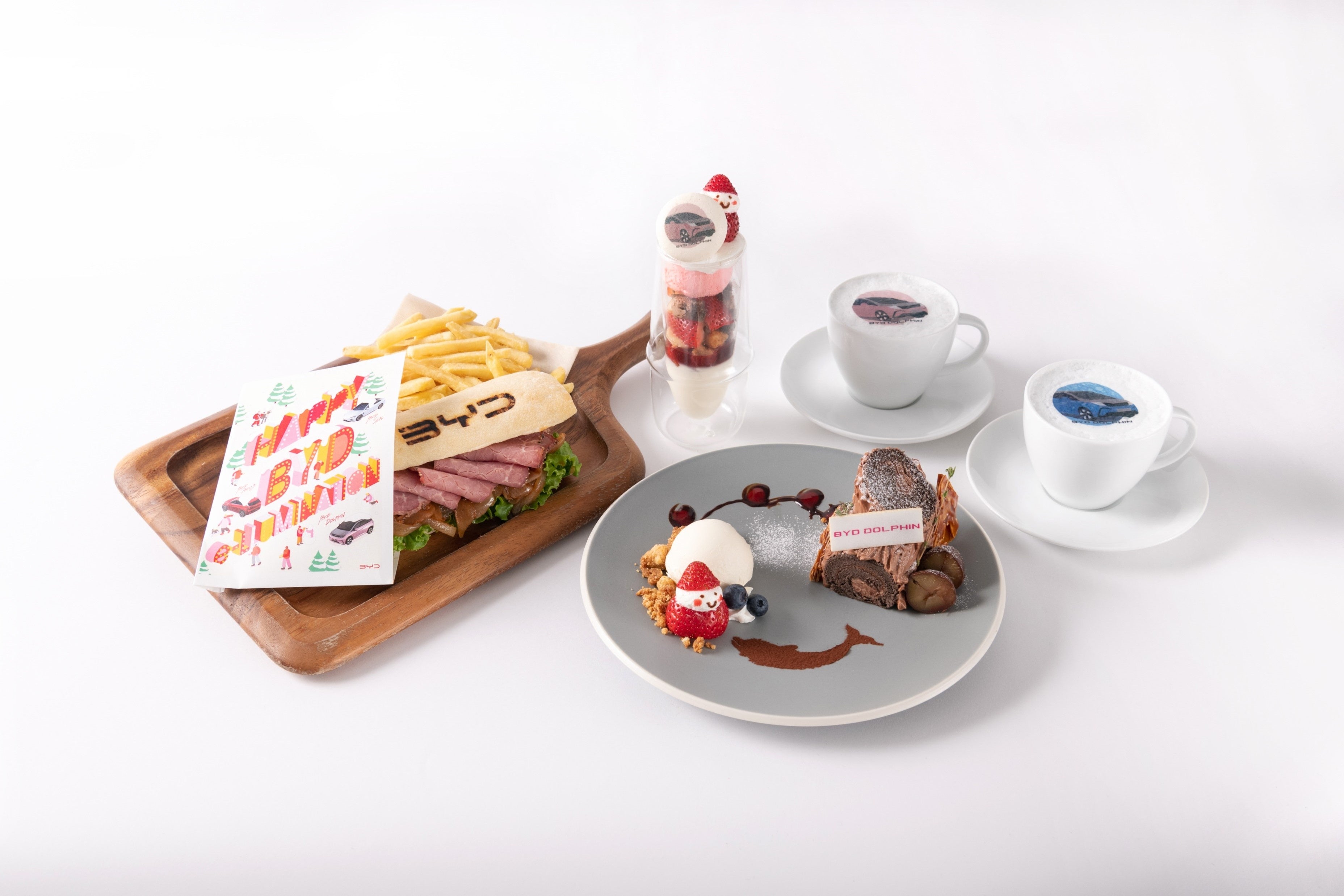 11月28日(火)~12月10日(日)の間、大屋根プラザに近接するヒルズカフェ/スペースにて「BYD e-LLUMINATION CAFE」と題し、期間限定のポップアップカフェを展開いたします。カフェ前にはクリスマスデコレーションを施したBYD ATTO 3とBYD SEALの車両を展示。カフェ内には9月に発売開始したコンパクトEVの決定版 BYD DOLPHINも展示いたします。また、『BYDイルミネーション ビーフサンドウィッチ』や『BYDブッシュ・ドルフィン・ノエル』など、今回のイベント期間中限定でお楽しみいただける、BYDオリジナルメニューもご提供します。また、会場でアンケートに回答いただいた方にはオリジナルメニューの『BYDドルフィンラテ』を無料でお楽しみいただけます。※3