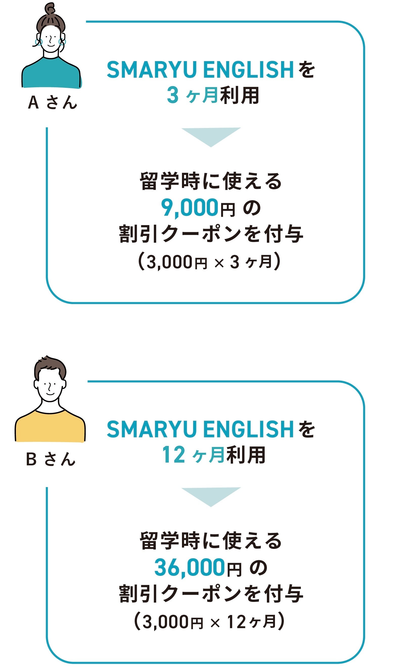 ”Smaryu English”でオンライン英会話を受講すると、受講期間によってスマ留での留学に行く際に適用できる割引クーポンが付与されます。オンライン英会話でお支払いいただいた費用の約半分を、そのまま留学費用に充てることが可能です。