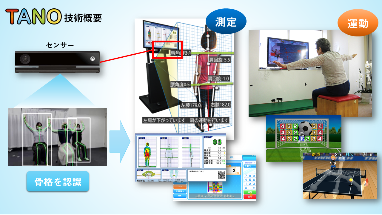 当社が開発する「TANO」は、モーションセンサーで骨格を読み取り体をコントローラー代わりにして直感的に運動や測定を行う事ができるゲーミフィケーションシステムとなっており、主に介護福祉施設における高齢者の運動促進や介護スタッフの業務負担軽減のために利用されています。
