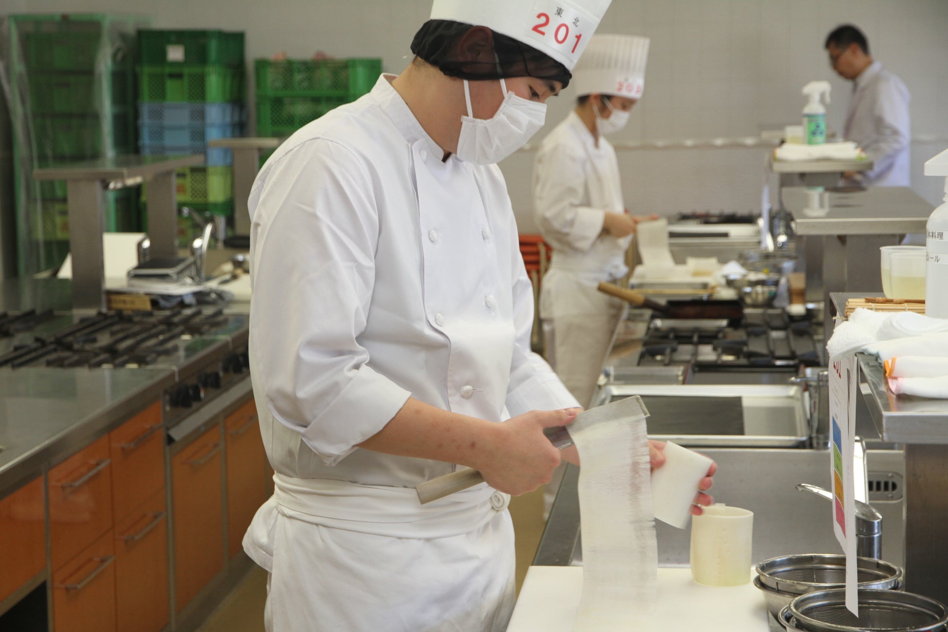 応用課題の調理(部門ごとに統一課題2作品)。作業・味見・作品審査を実施。