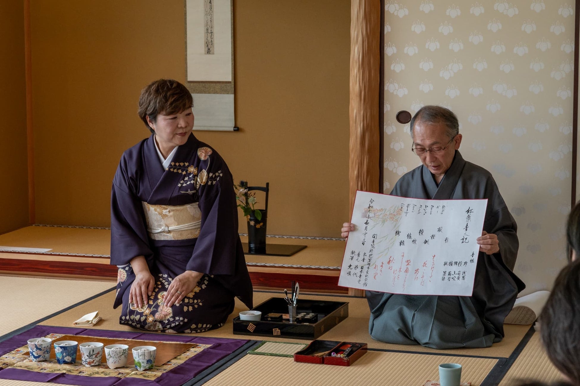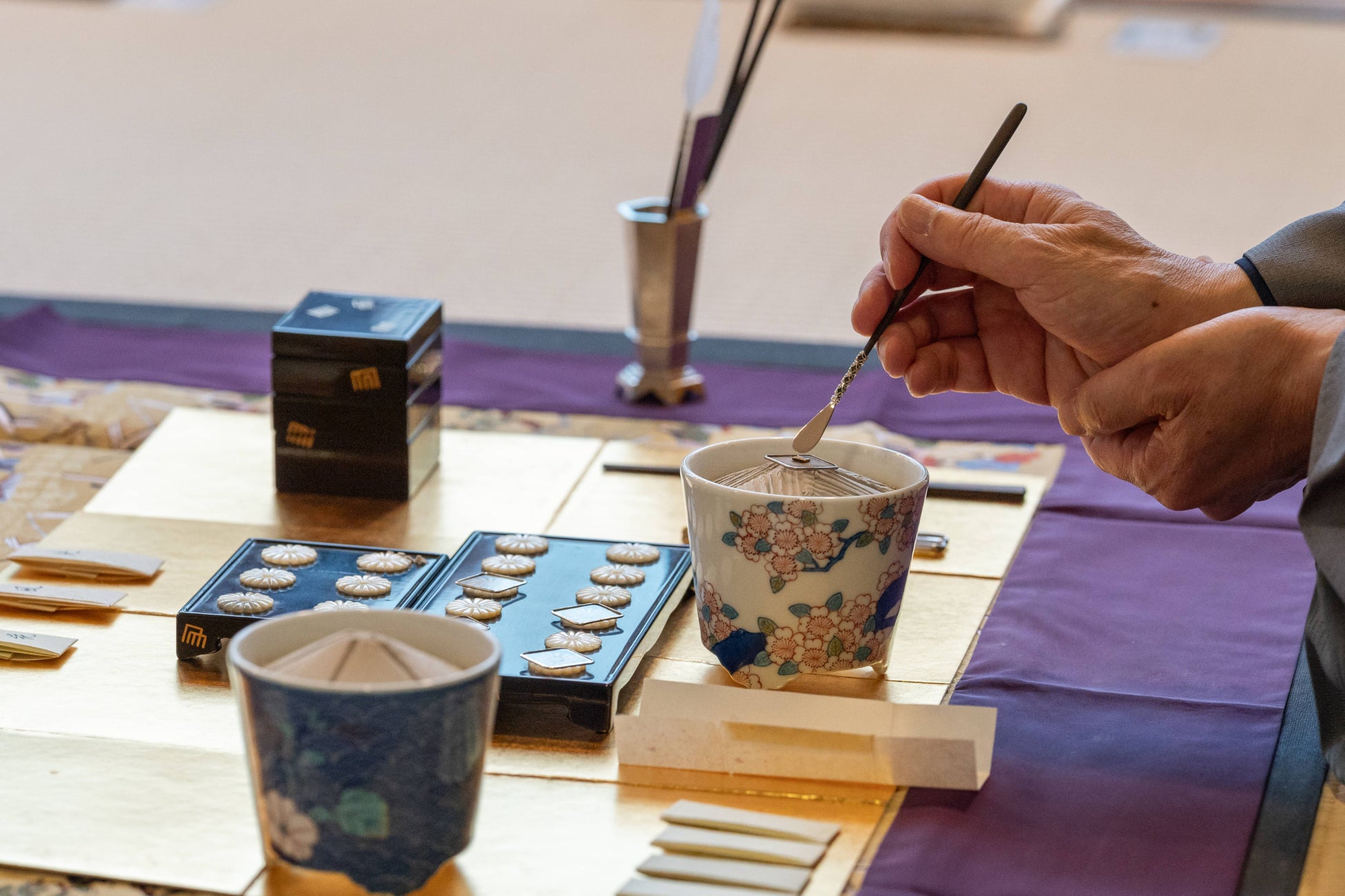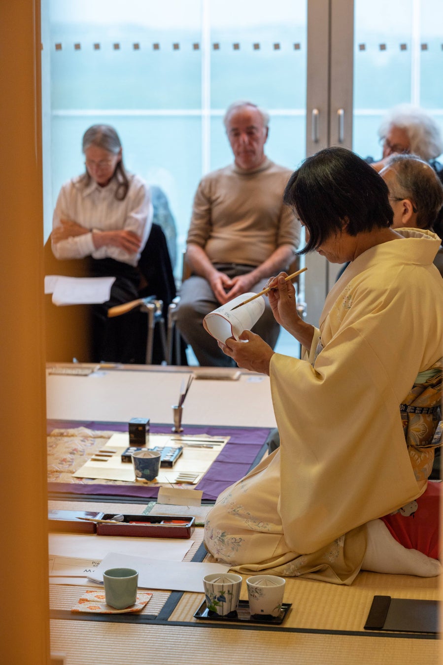 パリ日本文化会館でのお香会は、香道御家流の小畑嘵滉師範と細川堯順師範が、御家流スタッフや同会館の協力のもと厳かに執り行われました。参加者は、450年を記念して三條西堯水宗家が創作した新作組香『麗春香』をはじめ、秋の季節に合わせた『紅葉香』、銘名香『羅国 しらべ』といった奥深い香の世界を体験。さらに、佐賀県の鍋島焼の有限会社畑萬陶苑による新作『源氏物語聞香炉』が会に華を添え、最後には日本香堂が開発に参画した、会津若松の宮泉銘醸株式会社醸造の、記念の純米吟醸酒『暁霞-AKIGSUMI-』が振る舞われました。