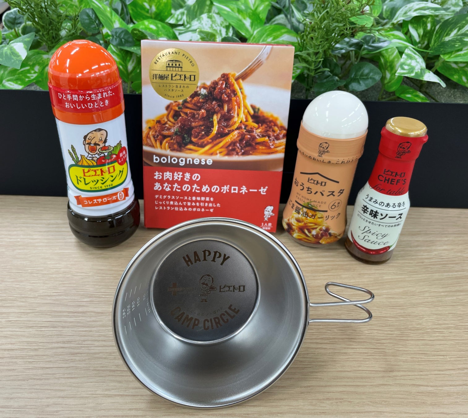 HAPPY CAMP CIRCLEメンバーイチオシ!ソトゴハンが更に充実する商品をセット(オリジナルのシェラカップ・巾着袋付き) で販売いたします。(税込3,000円)セットご購入のお客様には、ピエトロ商品が必ず当たる、お楽しみのサイコロゲームもご用意しております。(景品がなくなり次第終了)