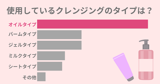 調査の結果、最も多くの人に使用されているのはオイルタイプのクレンジングで、つづいてバームタイプとジェルタイプのクレンジングが人気であることがわかりました。