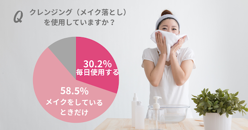 調査の結果、30.2%の女性がクレンジング(メイク落とし)を毎日使用し、58.5%の女性がメイクをしたときだけ使用していることがわかりました。