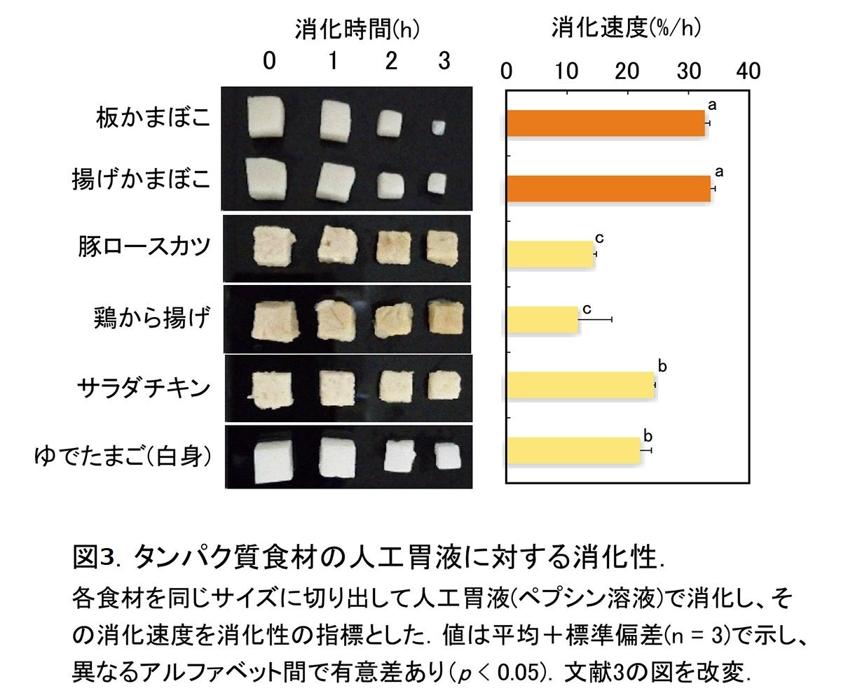 また、かまぼこなどの水産練り製品は畜肉や白身のゆでたまごと比べて人工胃液中で速やかに分解され、消化性が高いことも分かっています(図3) 3)。