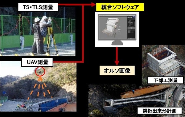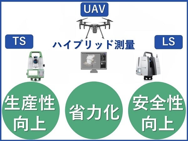 高性能UAV、高精度レーザースキャナー、および高精度トータルステーションを用いたハイブリッド測量システムでは、地上作業のみで計測が可能となります。これにより、従来技術と同程度の精度を確保しながら、安全性、作業効率が向上するシステムです。