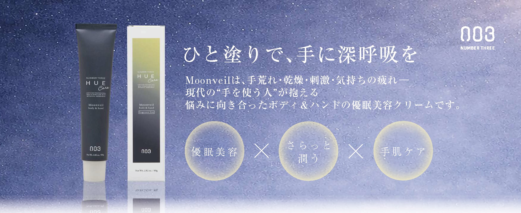 そんな考え方から生まれたのが、ナイトケア発想のボディ&ハンドクリーム 「HUE NightCare Moonveil(ナンバースリーヒュウ ナイトケア ムーンヴェール)」です。