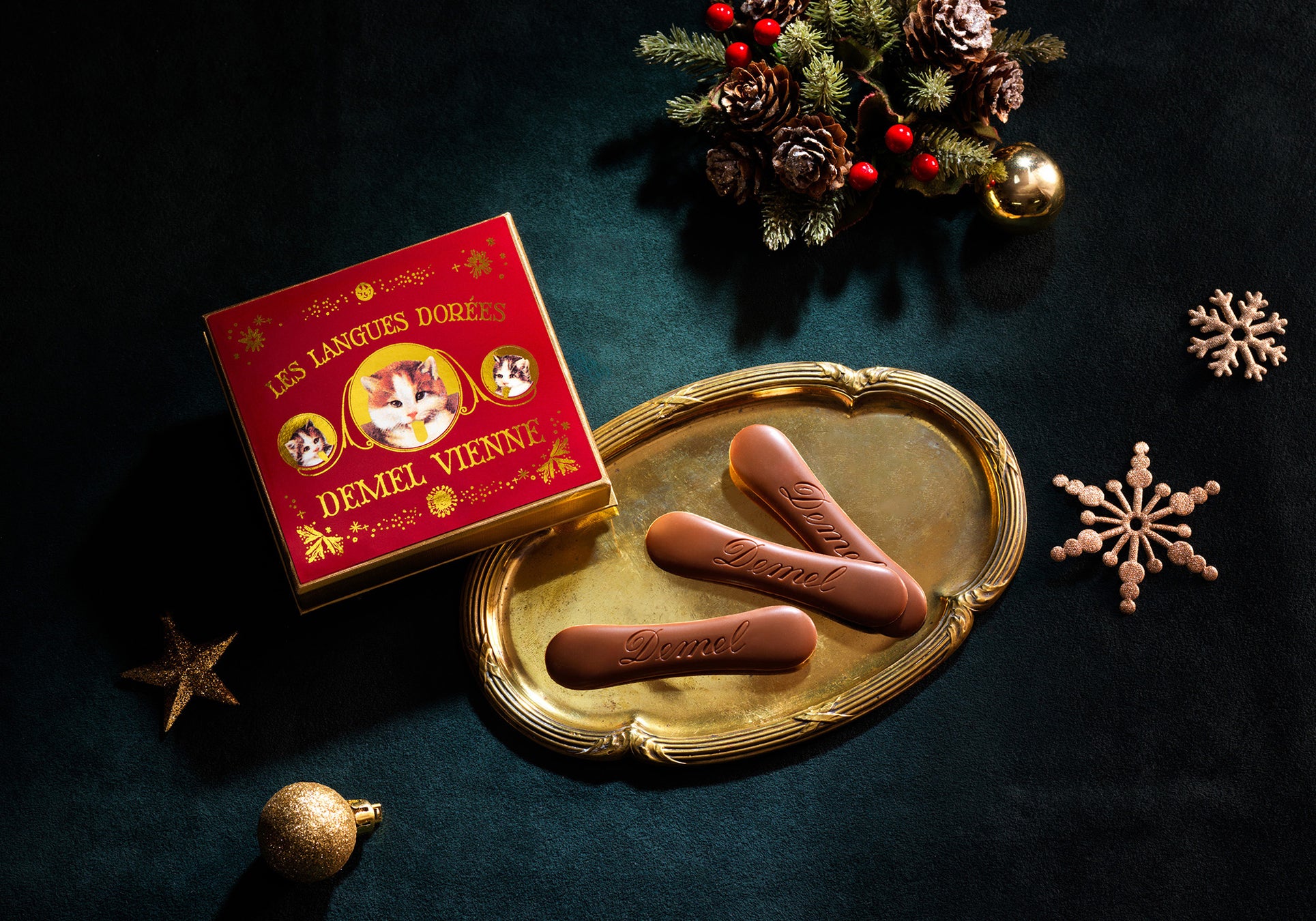 商品特長: デメルを代表する猫の舌の形をしたチョコレート。人気の「ミルク」をクリスマス限定のパッケージでご用意いたしました。今だけの特別なアイテムです。