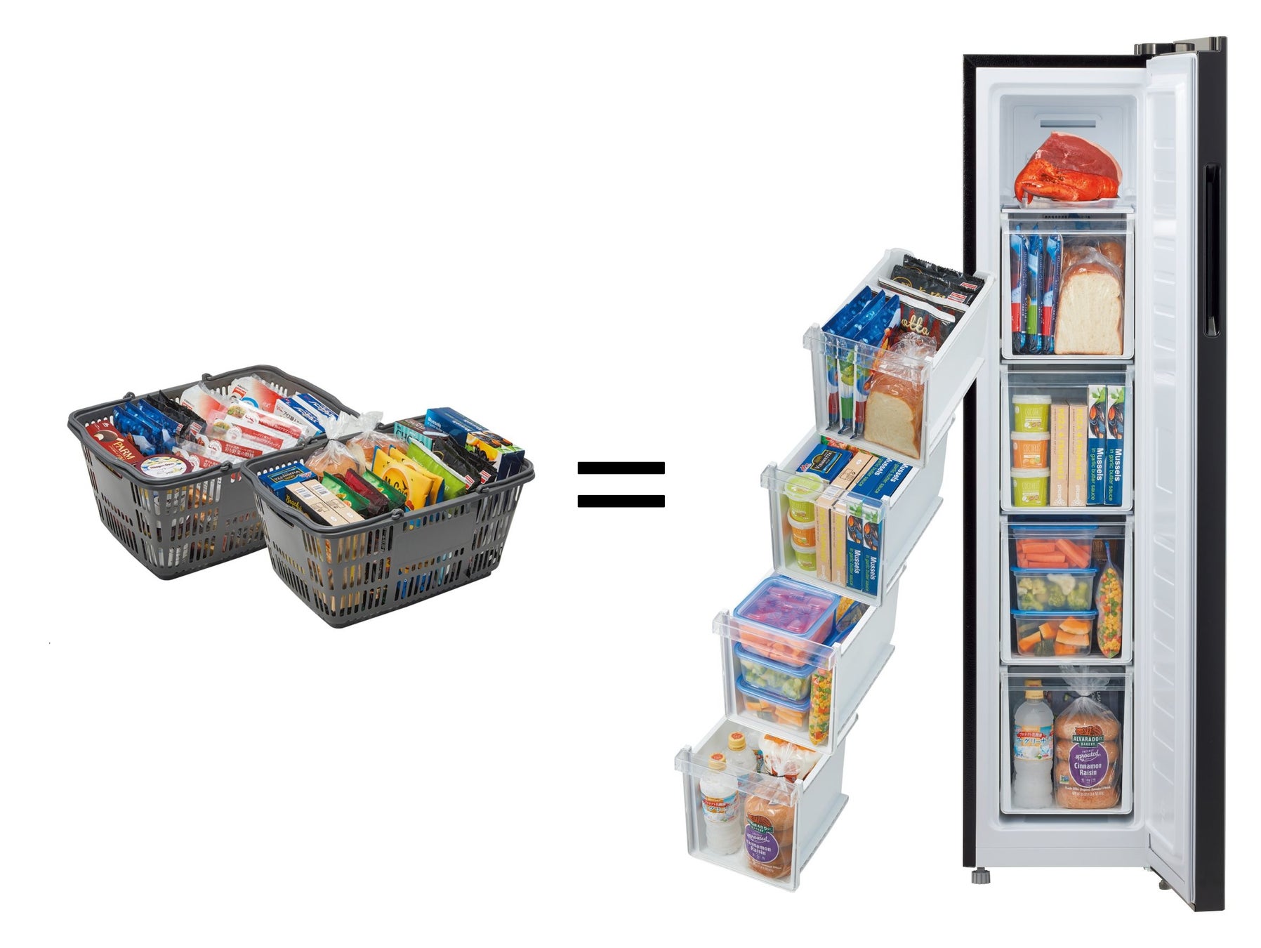幅36cmのスリムさながらロングボディ設計で買い物カゴ(※1)約2つ分の容量を確保しました。冷凍室の容量不足を解消します。
