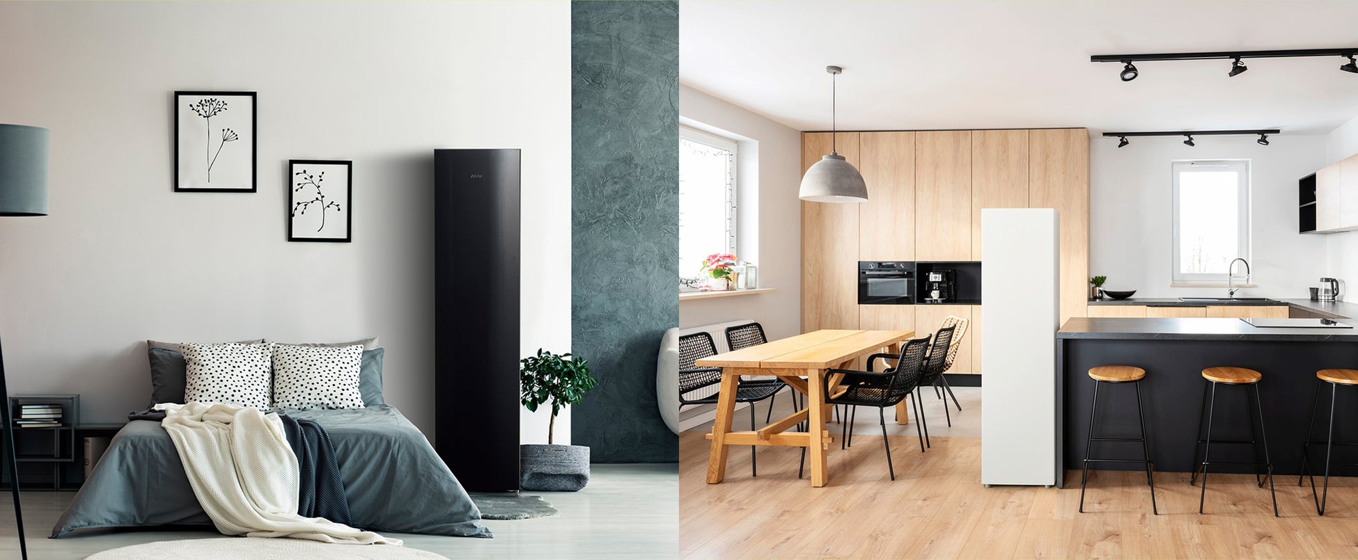 キッチンだけでなくリビングや寝室などの家具の間や隙間に入る36cm幅で、場所を選ばずに置くことができます。シンプルなデザインを採用し、扉には白・黒ともに控えめにパールをかけて柔らかな艶感を出すことで周囲の空間になじむ質感に仕上げました。