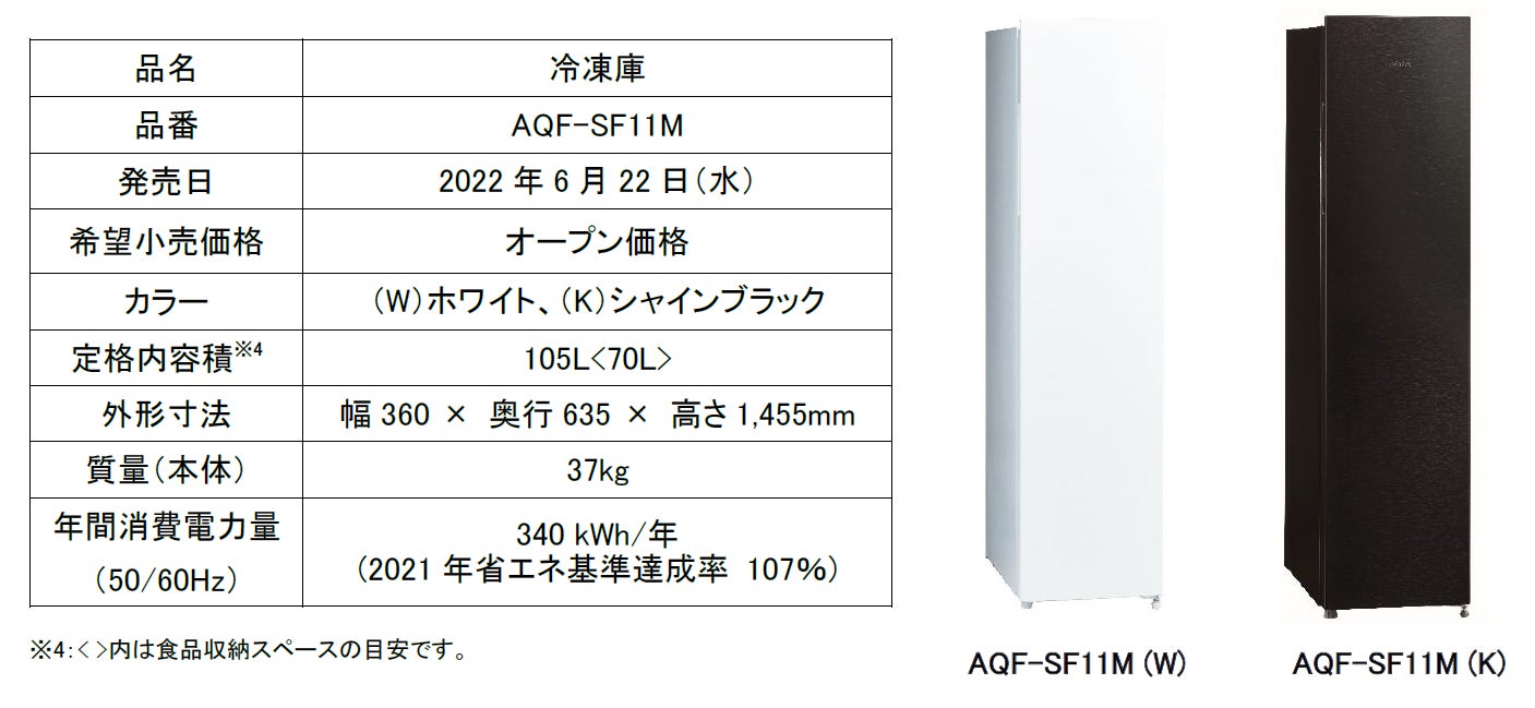 アクア株式会社(本社:東京都中央区、代表取締役社長 兼 CEO:杜 鏡国)は、冷蔵庫や家具のすき間に置けるスリムな横幅36cmのフリーザー「AQF-SF11M」を、2022年6月22日(水)に発売します。