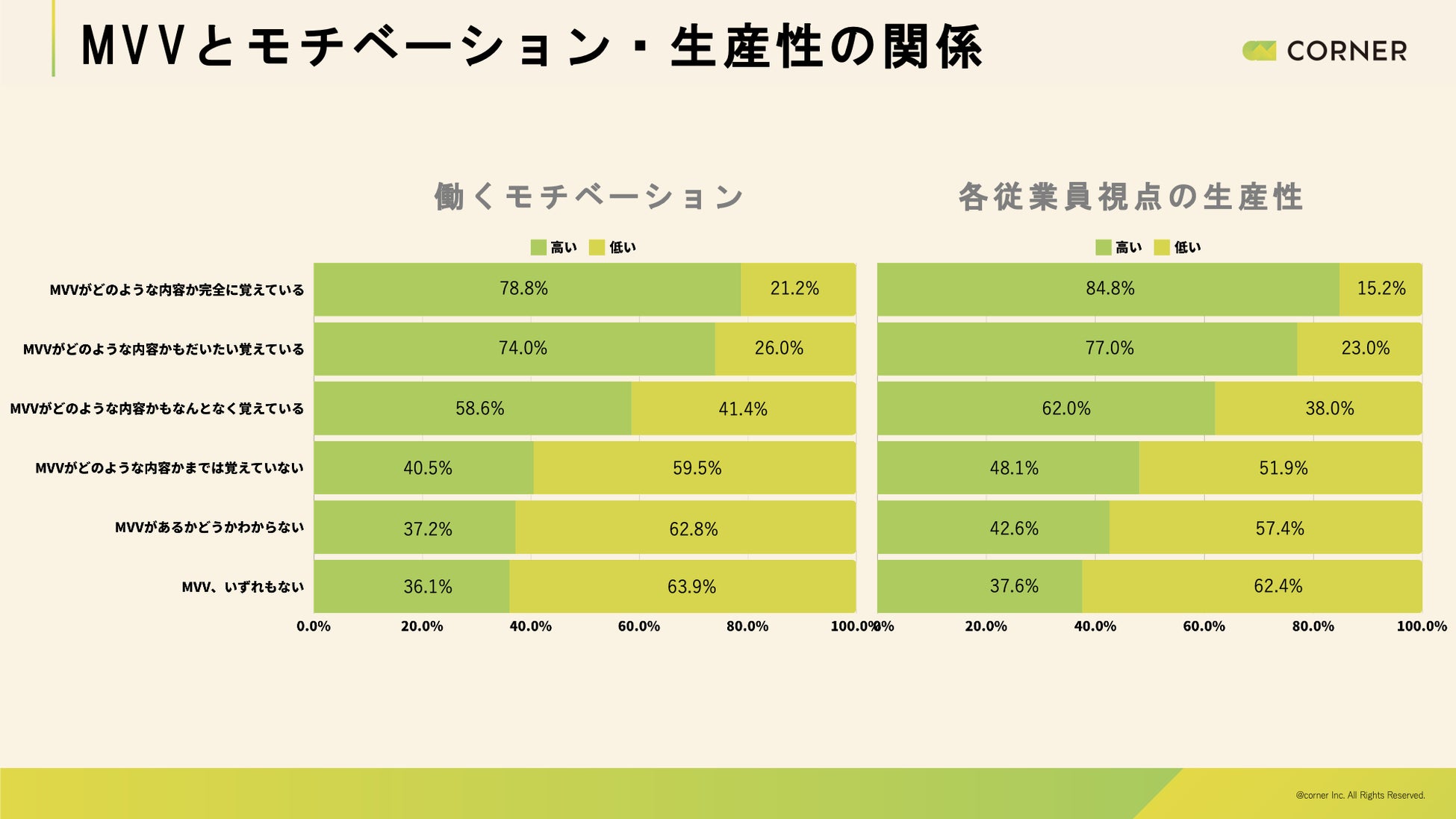 MVVを覚えている社員は働くモチベーション及び従業員視点の生産性は約60〜80%の社員が高いと答え、非常に高い結果になりました。