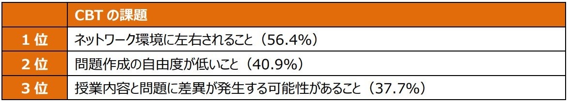 一方で、『CBT』の課題としては、「ネットワーク環境に左右されること」が56.4%と最も多く、「問題作成の自由度が低いこと」や「授業内容と問題に差異が発生する可能性があること」も挙げられており、学校現場や教員の実態に寄り添った『CBT』の必要性が高まっています。