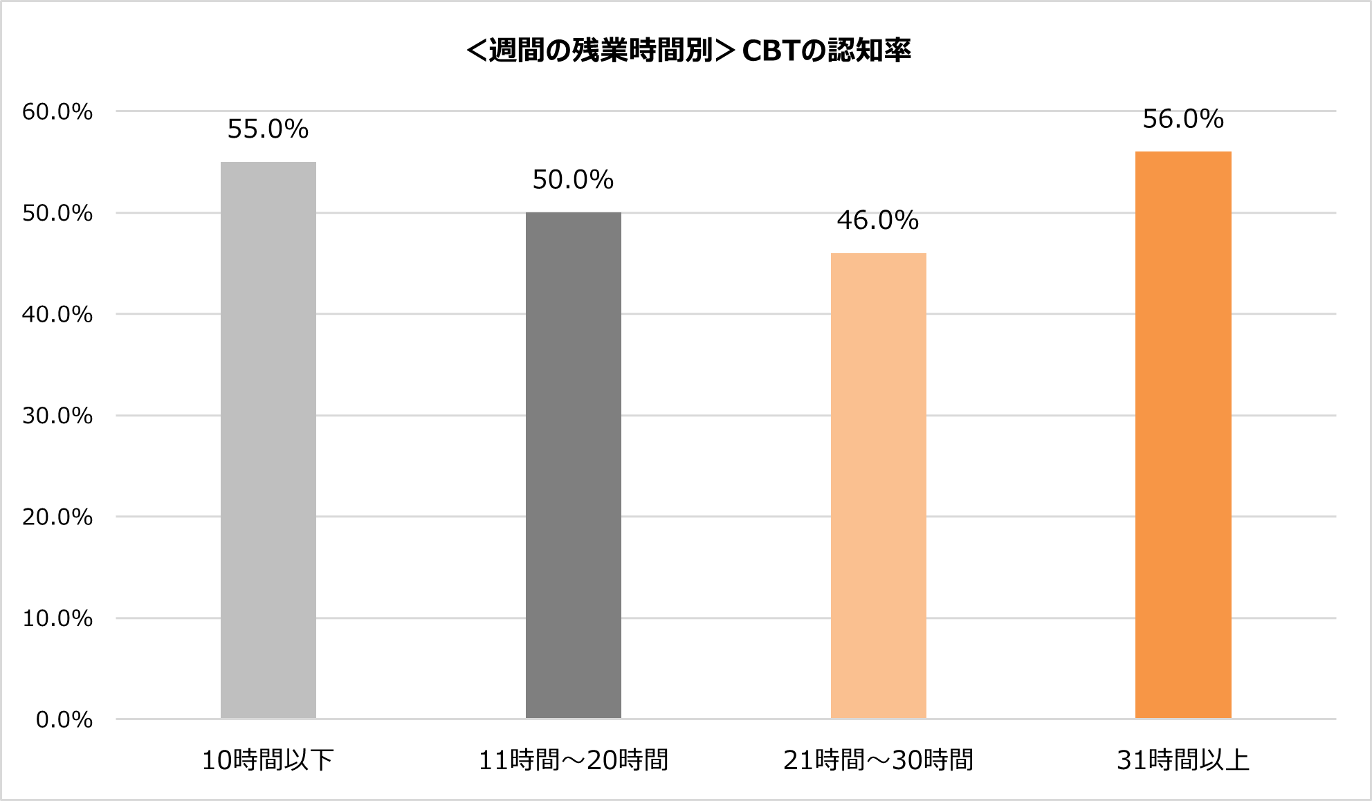 残業時間が少ない層は、『CBT』をはじめ、端末活用による業務の効率化を実現できている一方で、残業時間が多い層は自身の働き方改革にも関心があると推測されるため、その一つの解決策として『CBT』に対する認知度も比較的高くなっていることが予想されます。