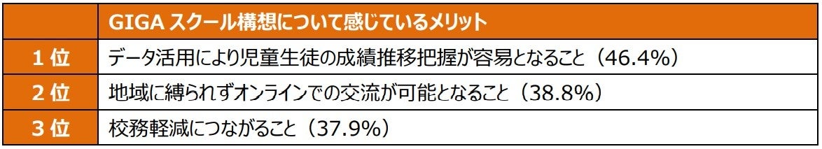 また、GIGA スクール構想から数年が経過し端末活用が浸透してきた中、教員の約2人に1人がデータ活用により児童生徒の成績把握が容易になったと回答したほか、3人に1人以上が校務軽減につながっていると感じていることが判明しました。『CBT』をはじめとする教育ICTの活用により効率的に校務を行うことが可能となり、教員の働き方に変化の兆しが見え始めたことが伺えます。さらに、ビデオ通話など端末を利用することで、地域に縛られないオンラインでの交流が可能となり、学びの幅が広がる点にメリットを感じている教員も多いことがわかりました。