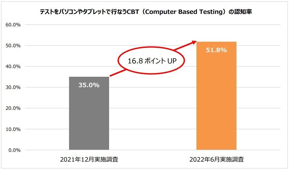 今回の調査では、教員の80%が「『CBT』を実施したい」と回答しました。加えて、CBTの認知度が50%を超え、半年で17ポイント増加していることが判明し、1人1台端末活用法の一つとして、『CBT』が大きく期待されていることが示唆されました。