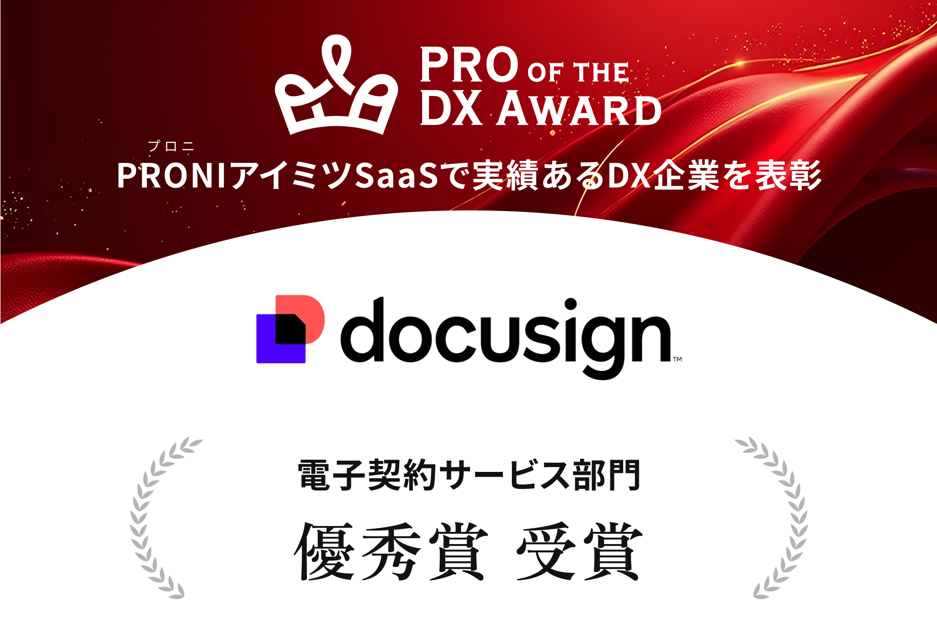 「PRO of the DX Award 2025(上期)」では、電子契約サービス部門において優秀賞を受賞しました。本アワードは、PRONIアイミツSaaSにおいて、優れた利用実績(成約数など)を基準に、上位10%以内の企業を表彰する制度で、ドキュサインの導入実績と高い評価が認められた結果となりました。