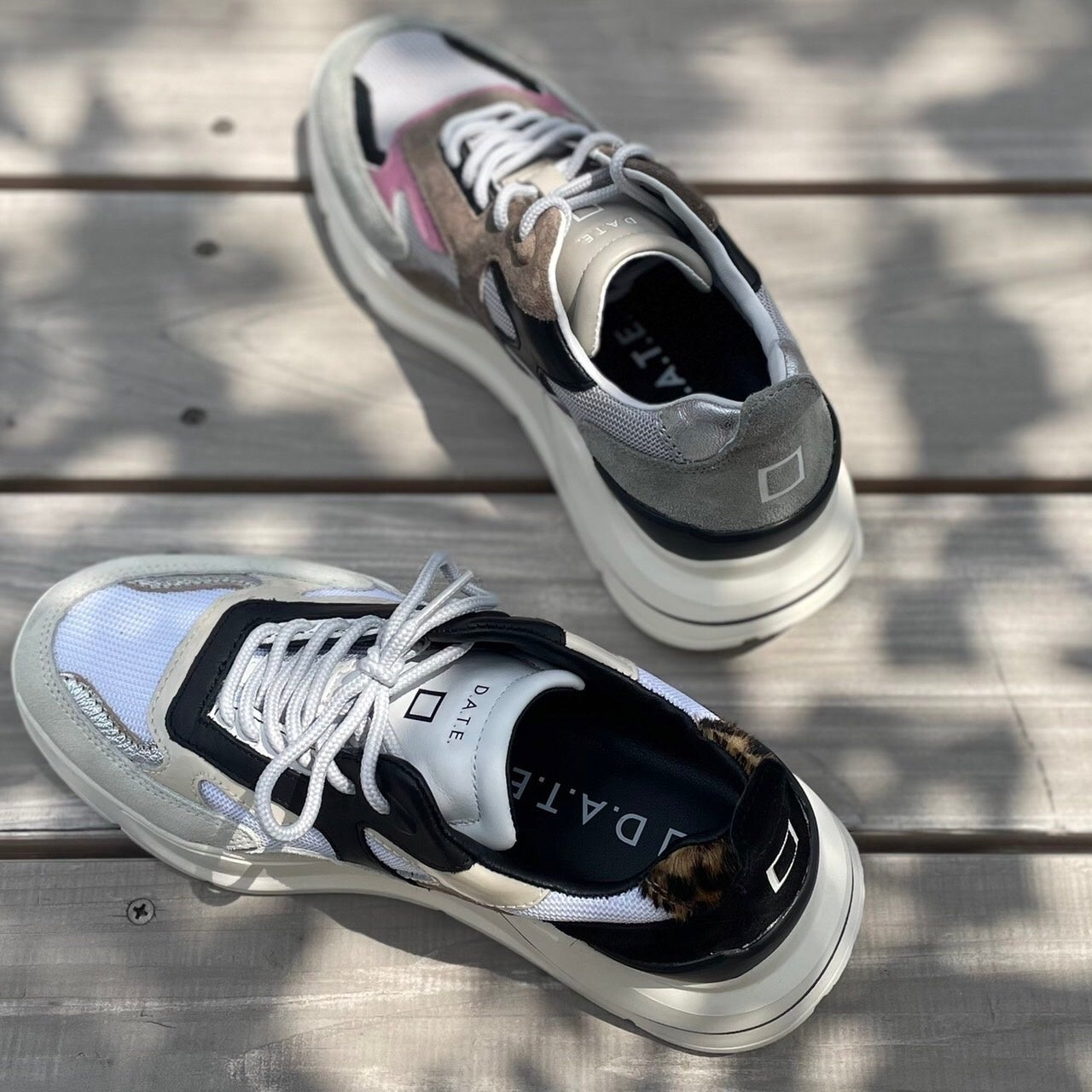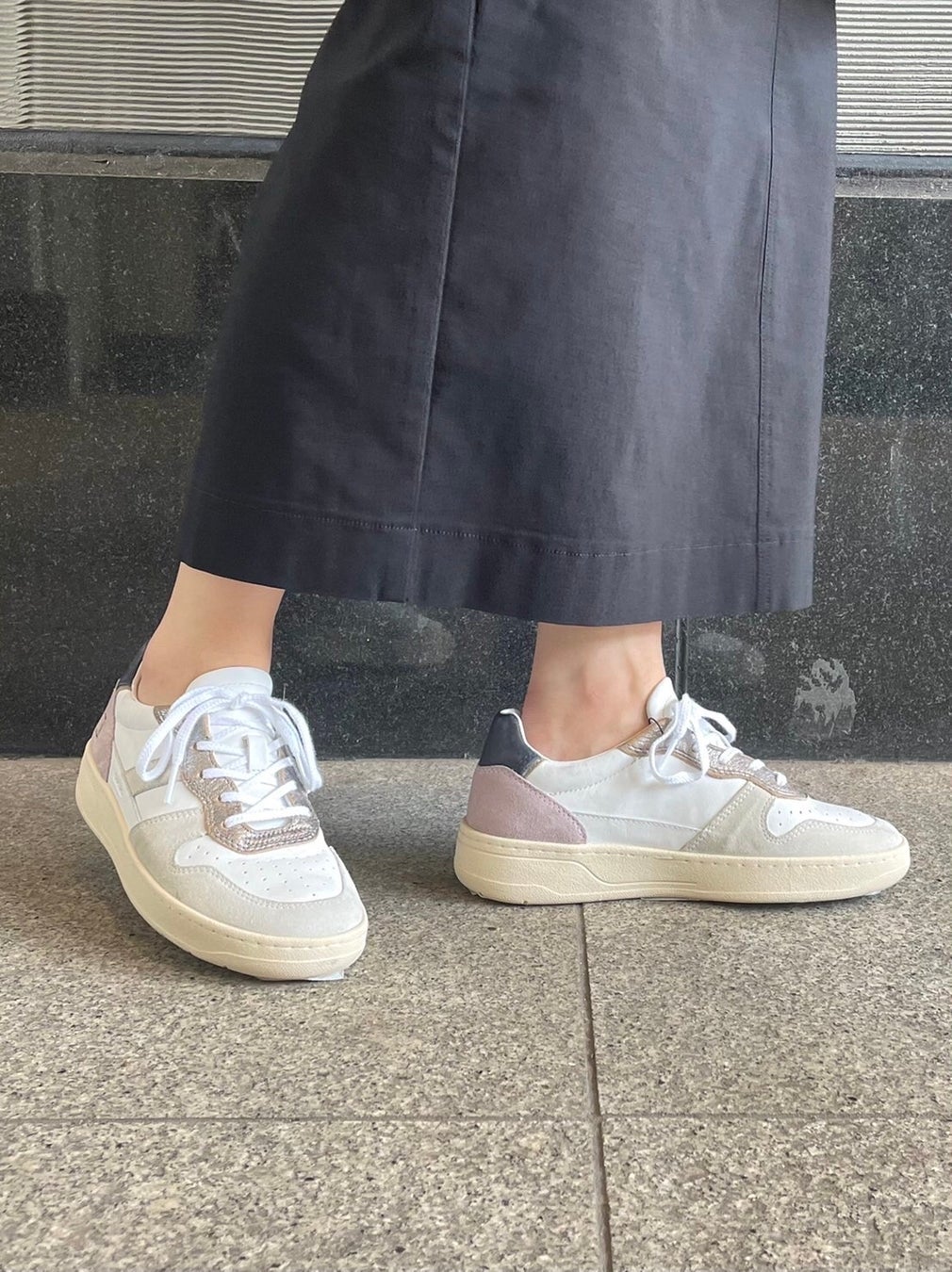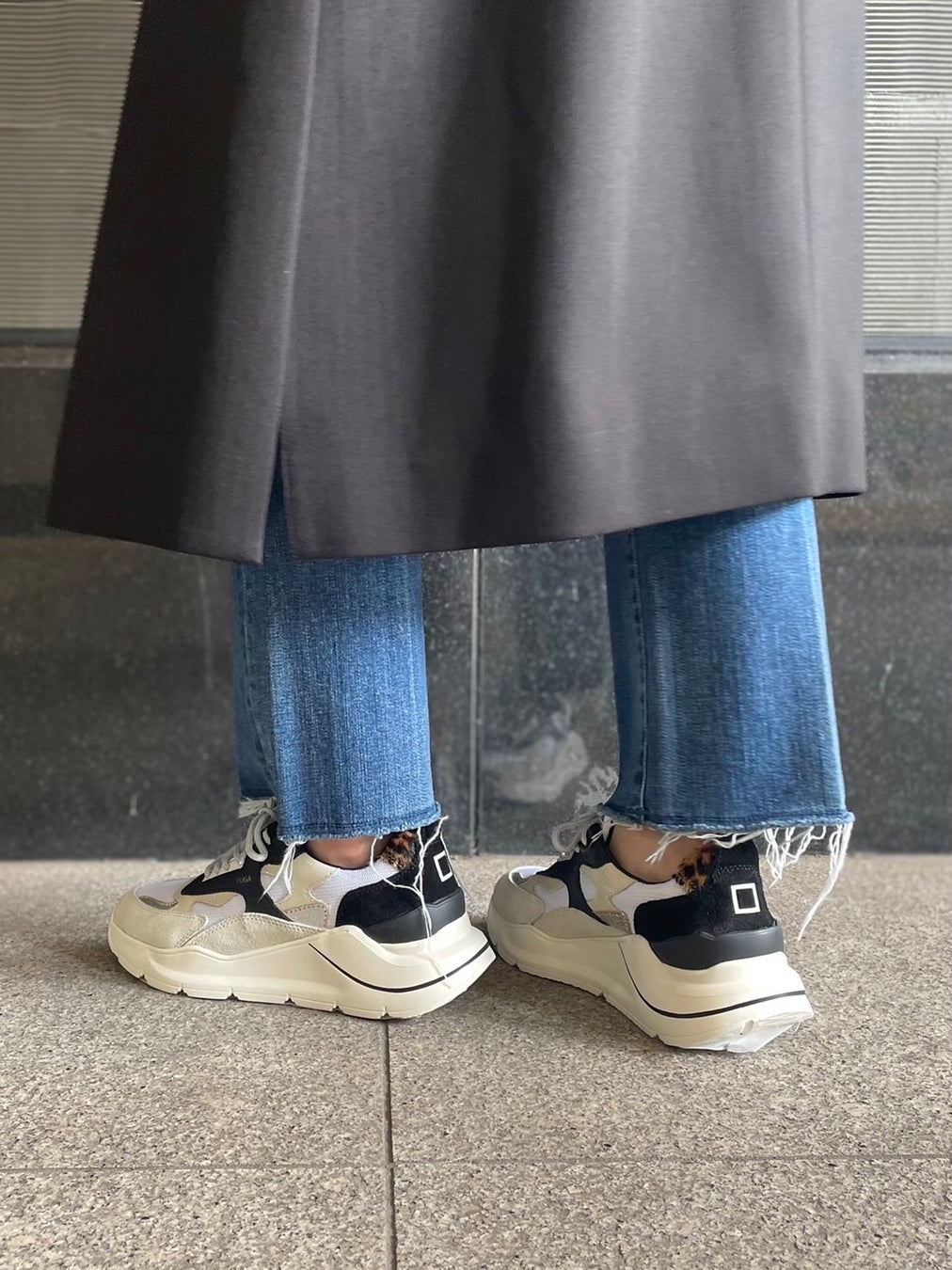 曲線が重なったようなモダンなデザインと、キャッチーな配色や柄がアクセントに。カジュアルでありつつラグジュアリーな雰囲気を漂わせる、D.A.T.E.(デイト)らしい一足。