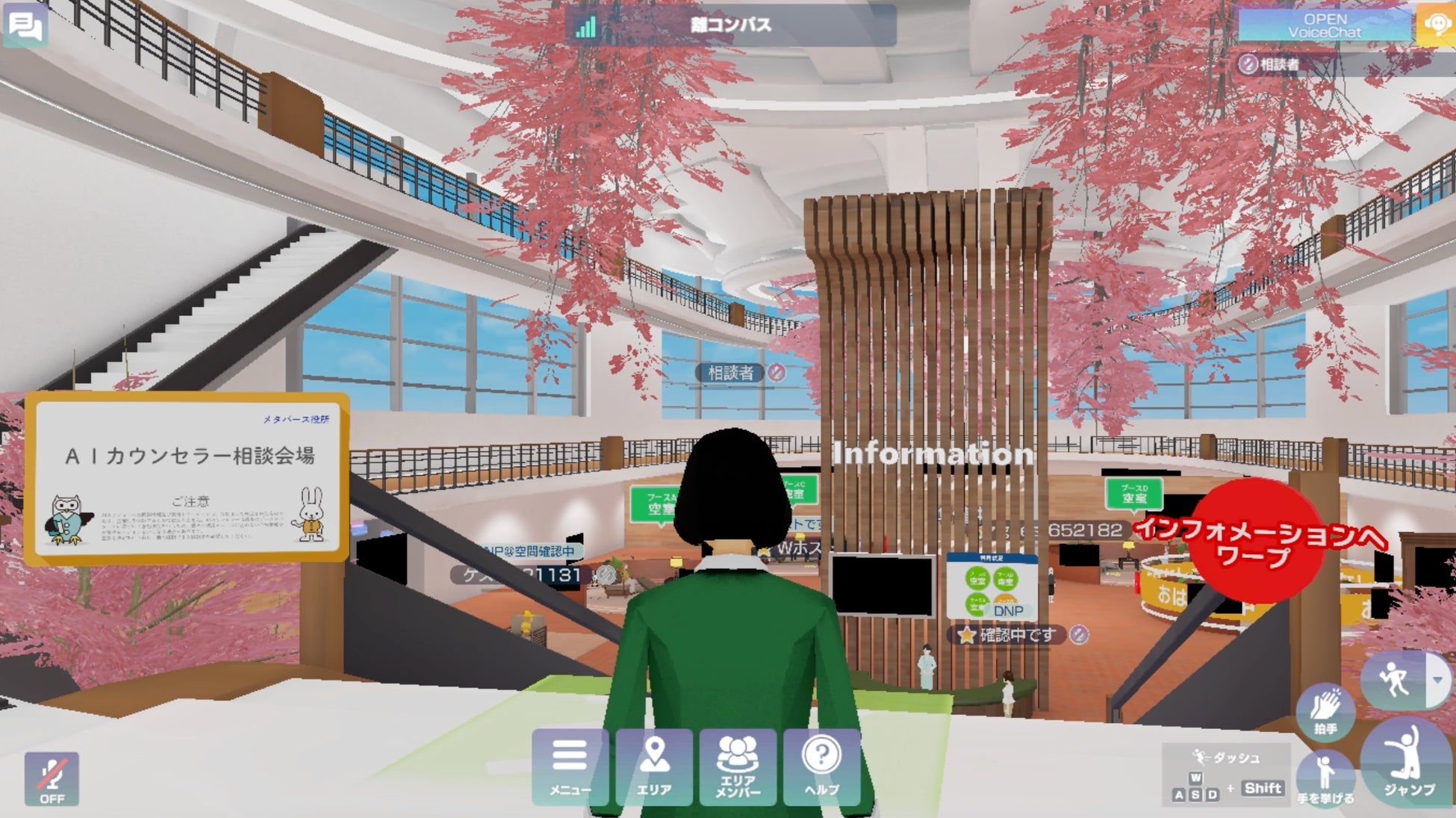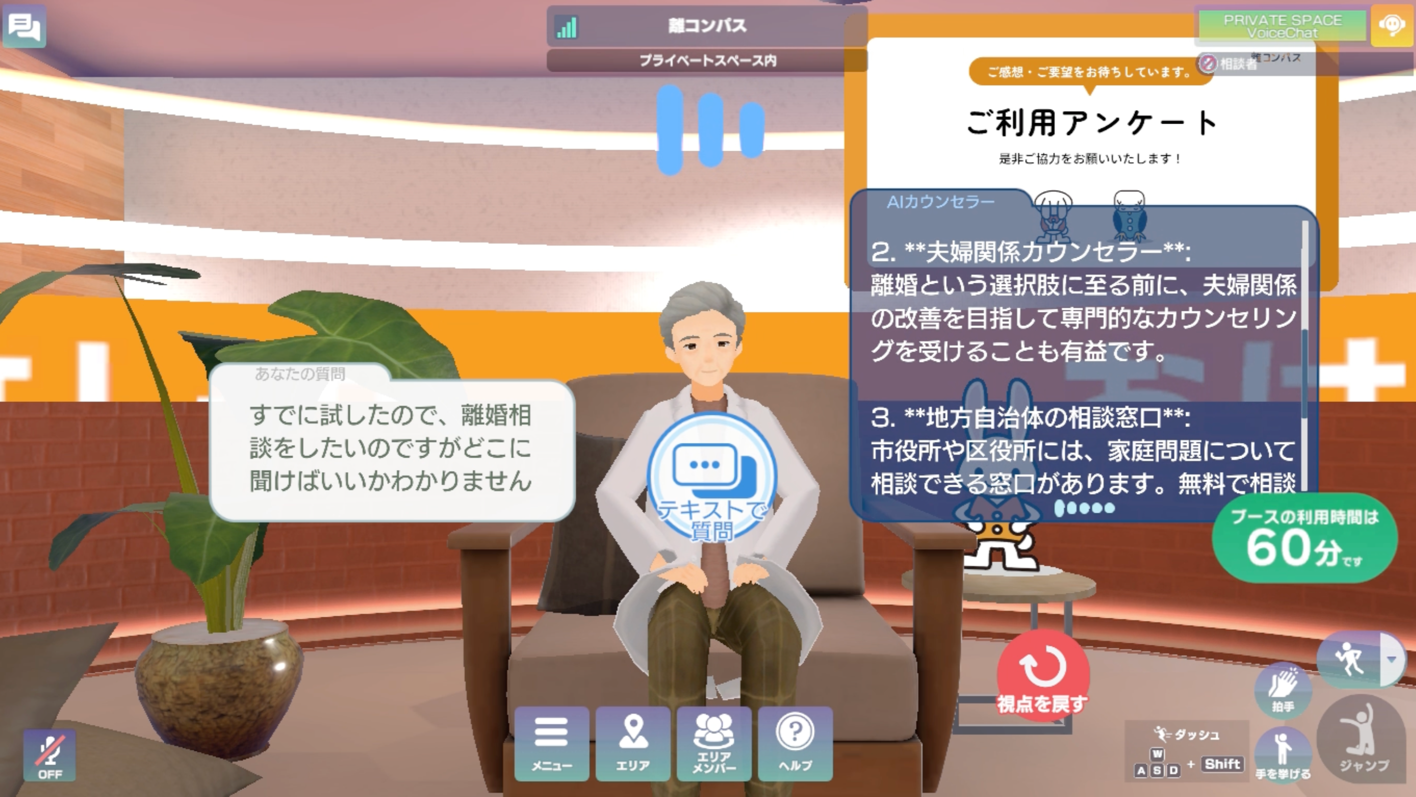「メタバース役所」へ訪れると、『出張版離コンパス』としての相談ブースが配置されており、AIアバター相談員(AIカウンセラー)が個々のお悩みに寄り添い、期間中は24時間365日での対応が可能です。